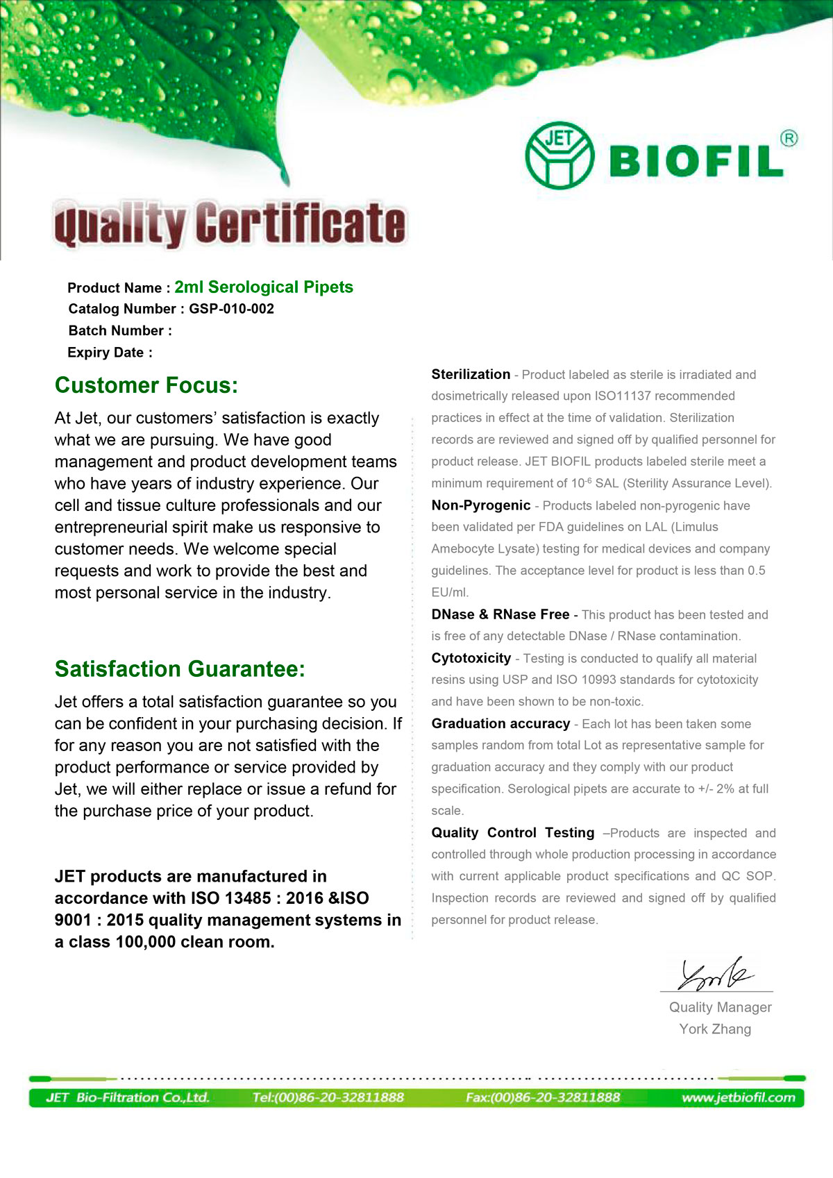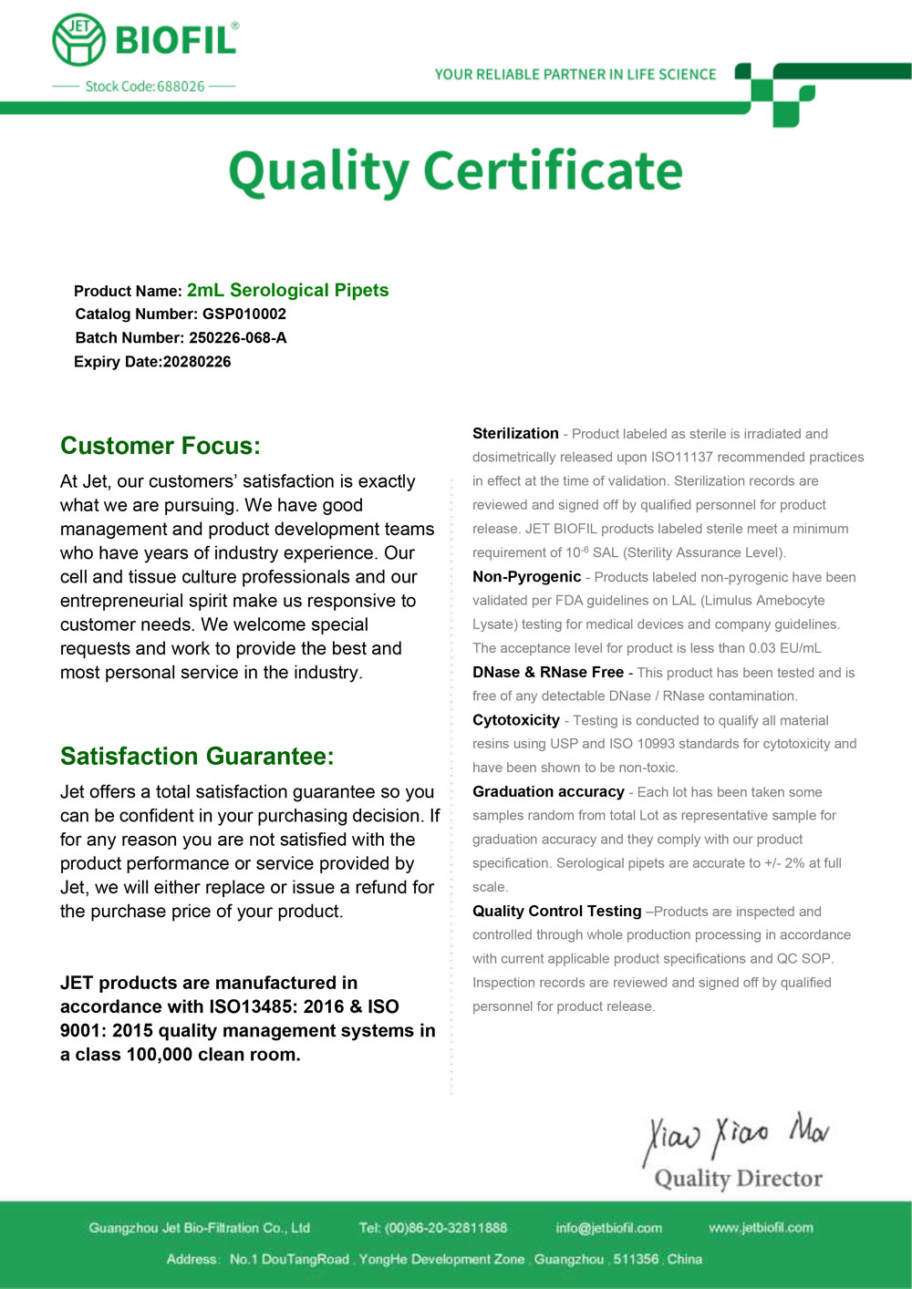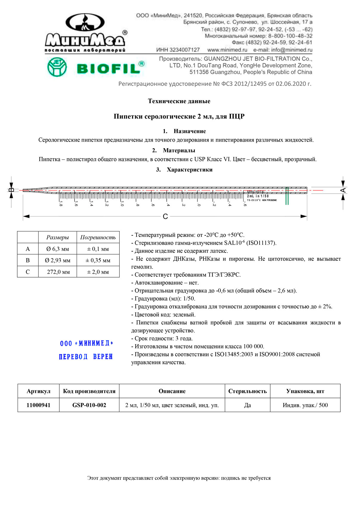 - Сертификат. Пипетка серологическая 2 мл, для ПЦР. Jet Bio-Filtration GSP010002 с