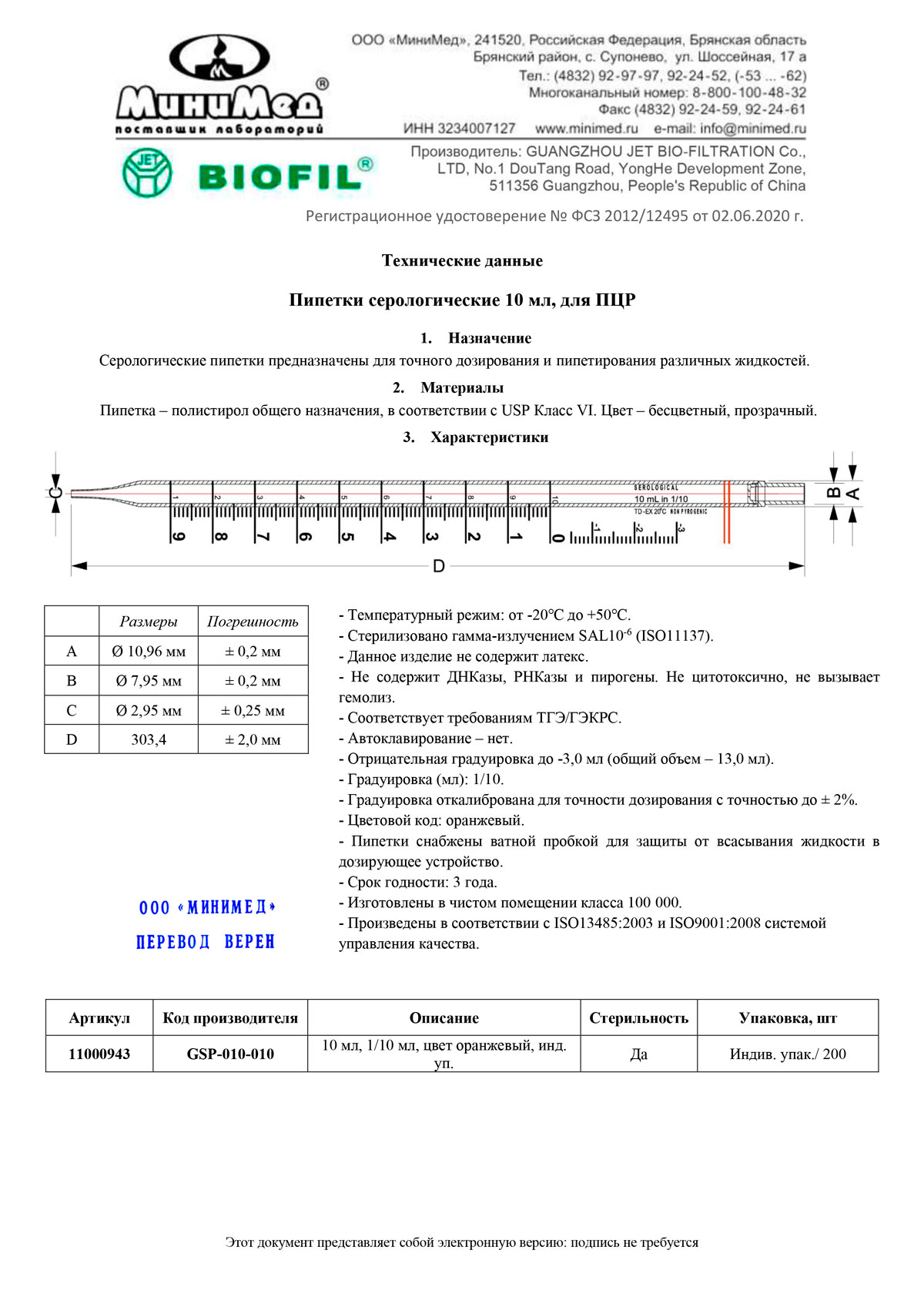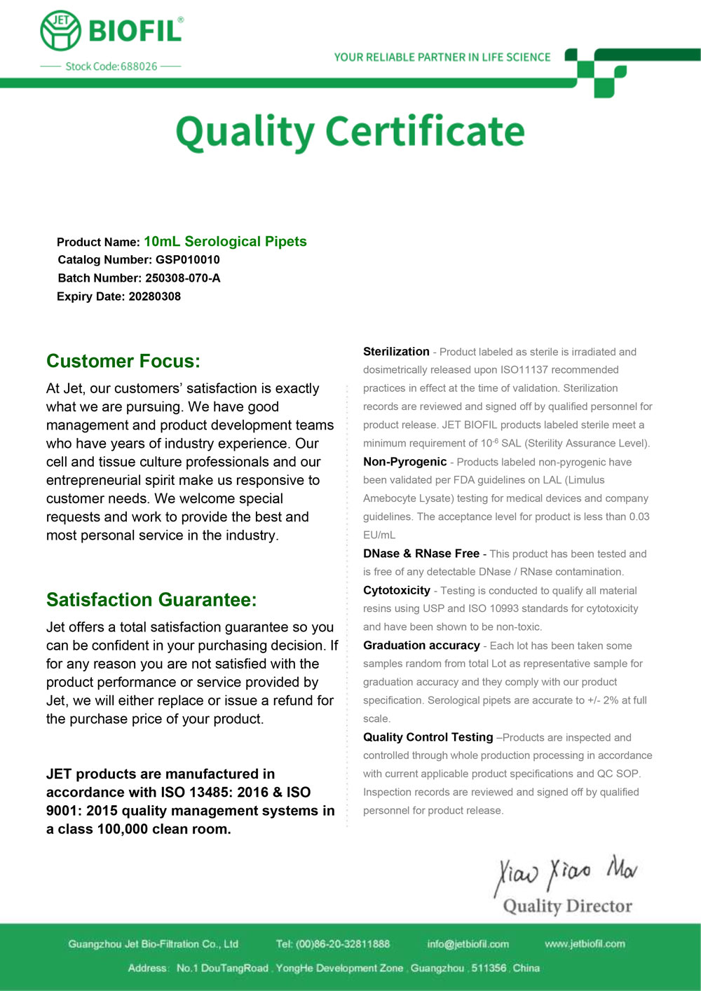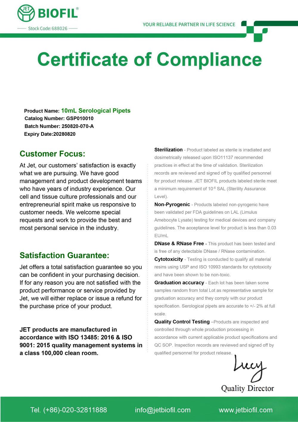 - Сертификат. Пипетка серологическая 10 мл, для ПЦР. Jet Bio-Filtration GSP010010