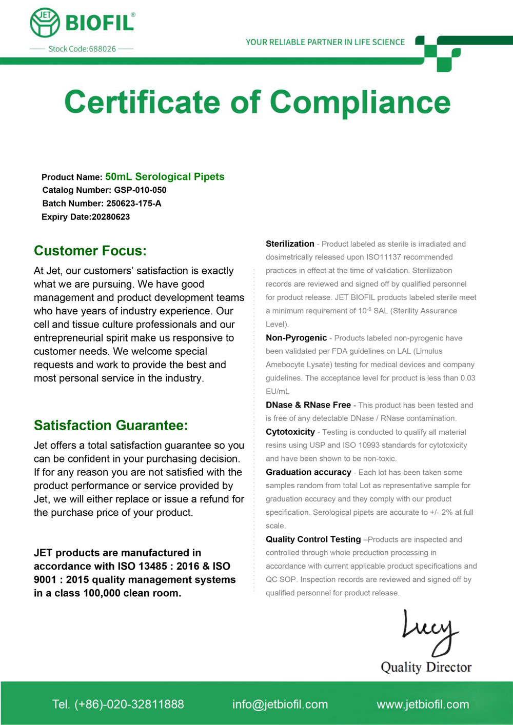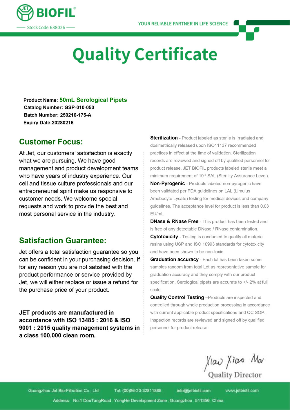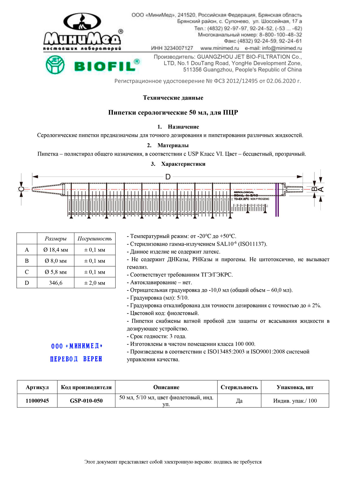 - Сертификат. Пипетка серологическая 50 мл, для ПЦР. Jet Bio-Filtration GSP010050