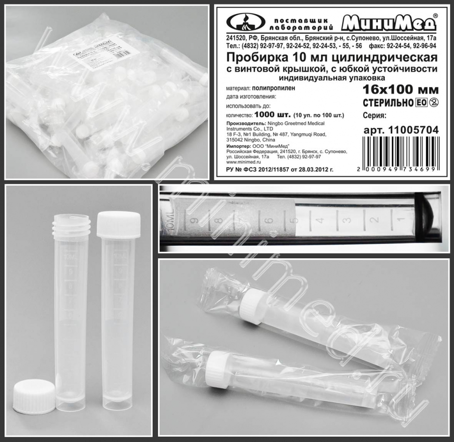 Пробирка цилиндрическая 10 мл, 16×100 мм, с винт.крышкой, с дел., п/п, с основанием, стер., инд.уп./100/1000 шт, Гритмед