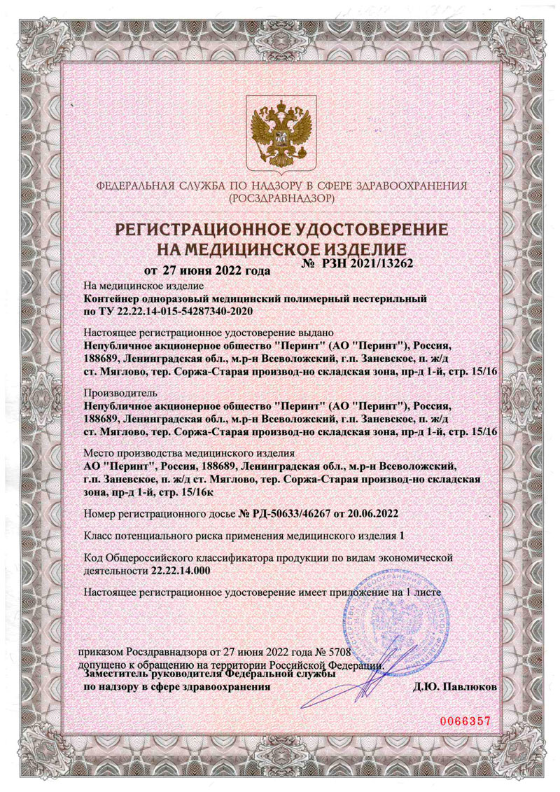 РУ № РЗН 2021/13262 от 27.06.2022 г.
