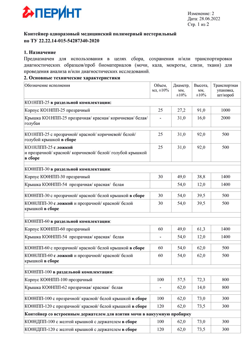 - Контейнер одноразовый медиц. полимерный нестерильный. Перинт. Технические данные