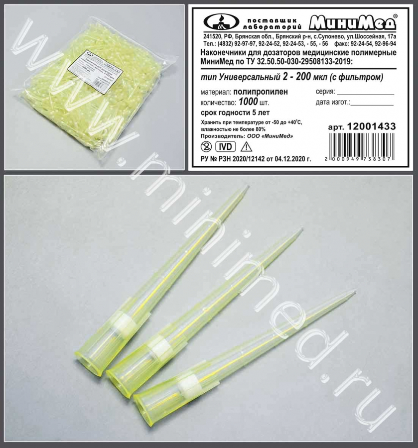 Наконечник д/дозаторов тип Универсальный с фильтром 2-200 мкл, жёлтый, уп.1000 шт, ТУ 32.50.50-030-29508133-2019, МиниМед