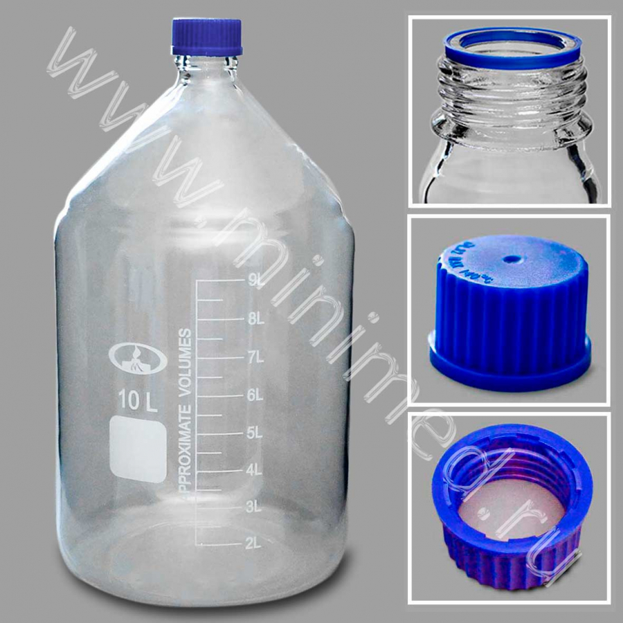 Предназначена для хранения химических реактивов. Изготовлена из химико-лабораторного стекла, крышка изготовлена из полипропилена. На горлышке есть уплотнительное кольцо. Градуированы до 9 л.