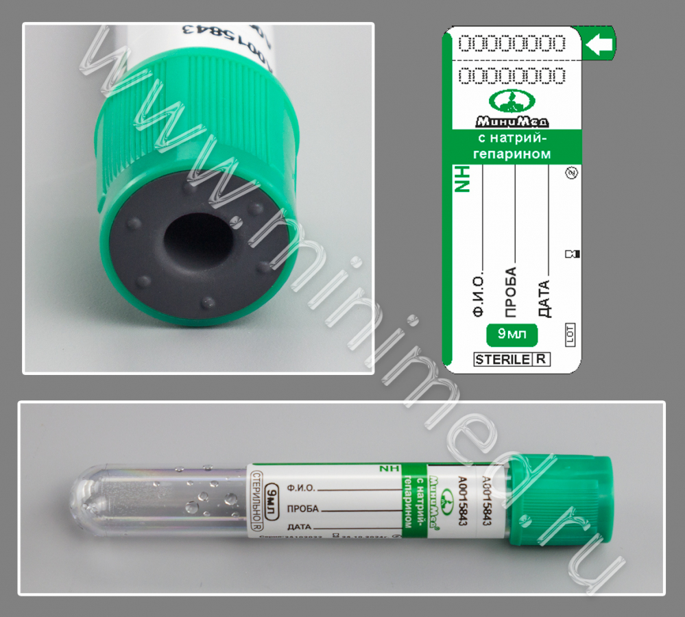 Пробирка вакуумная МиниМед с натрия гепарином, 9 мл, 16×100 мм, зеленый, ПЭТФ, уп.100 шт.
