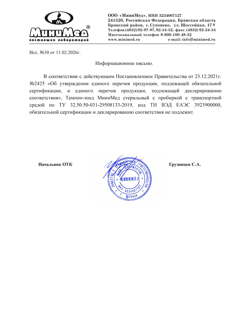 - Исх. № 30 Инфо Тампон-зонд МиниМед стерильный с пробиркой с транспортной средой с
