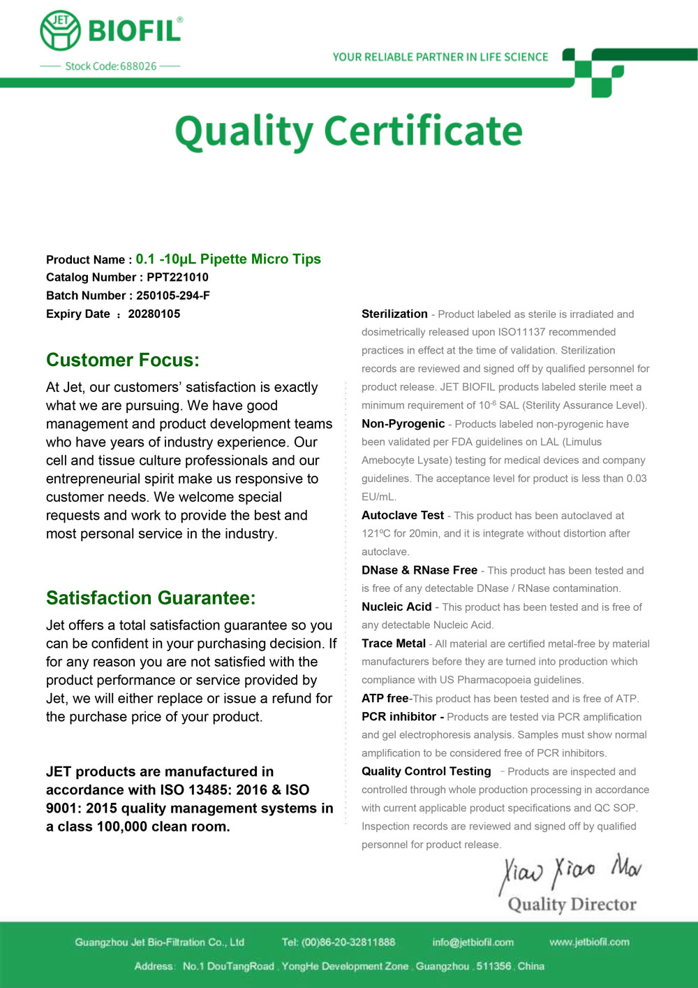 - Сертификат. Наконечник для дозаторов 0,1-10 мкл, без фильтра, Jet-Bio-Filtration,