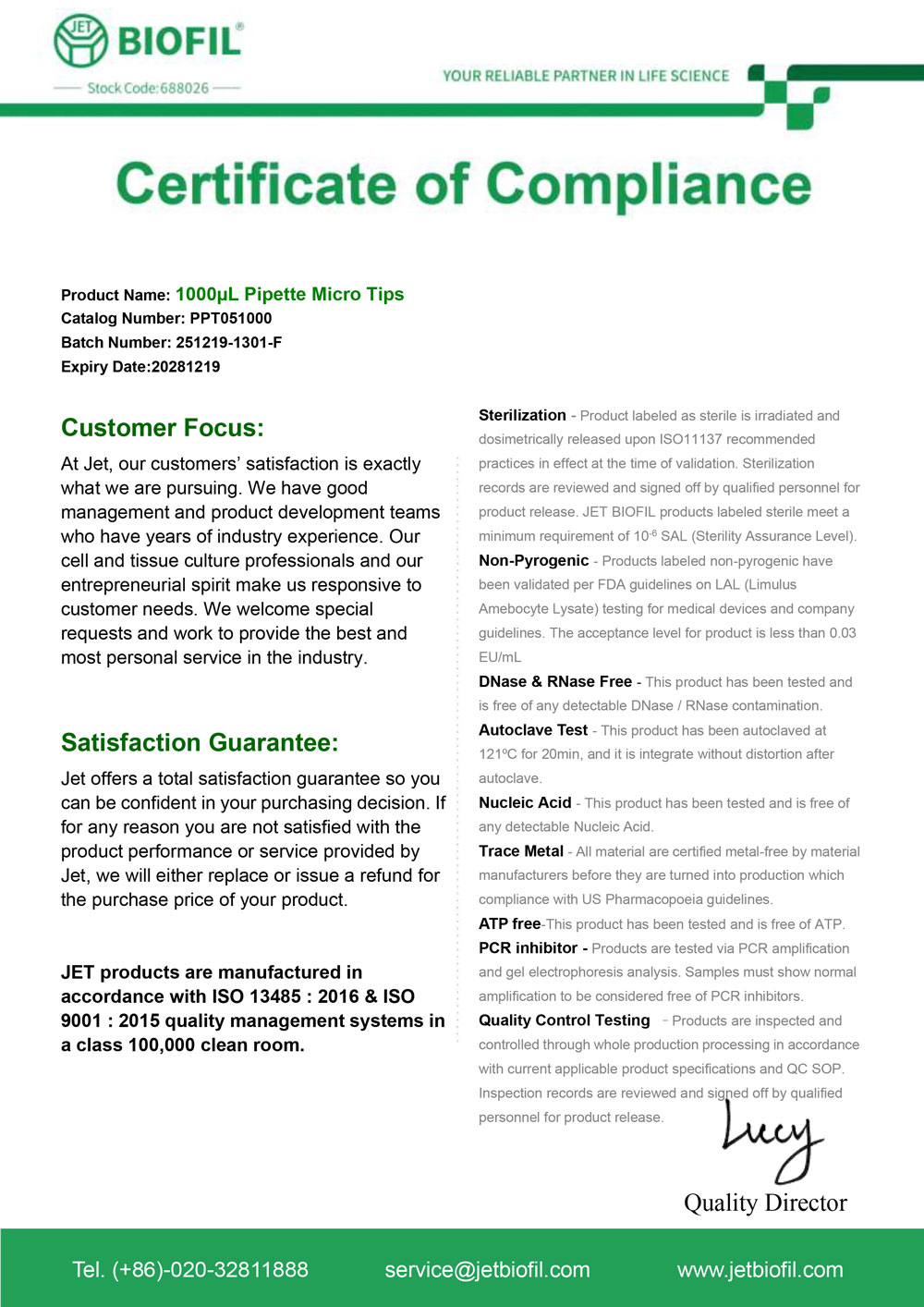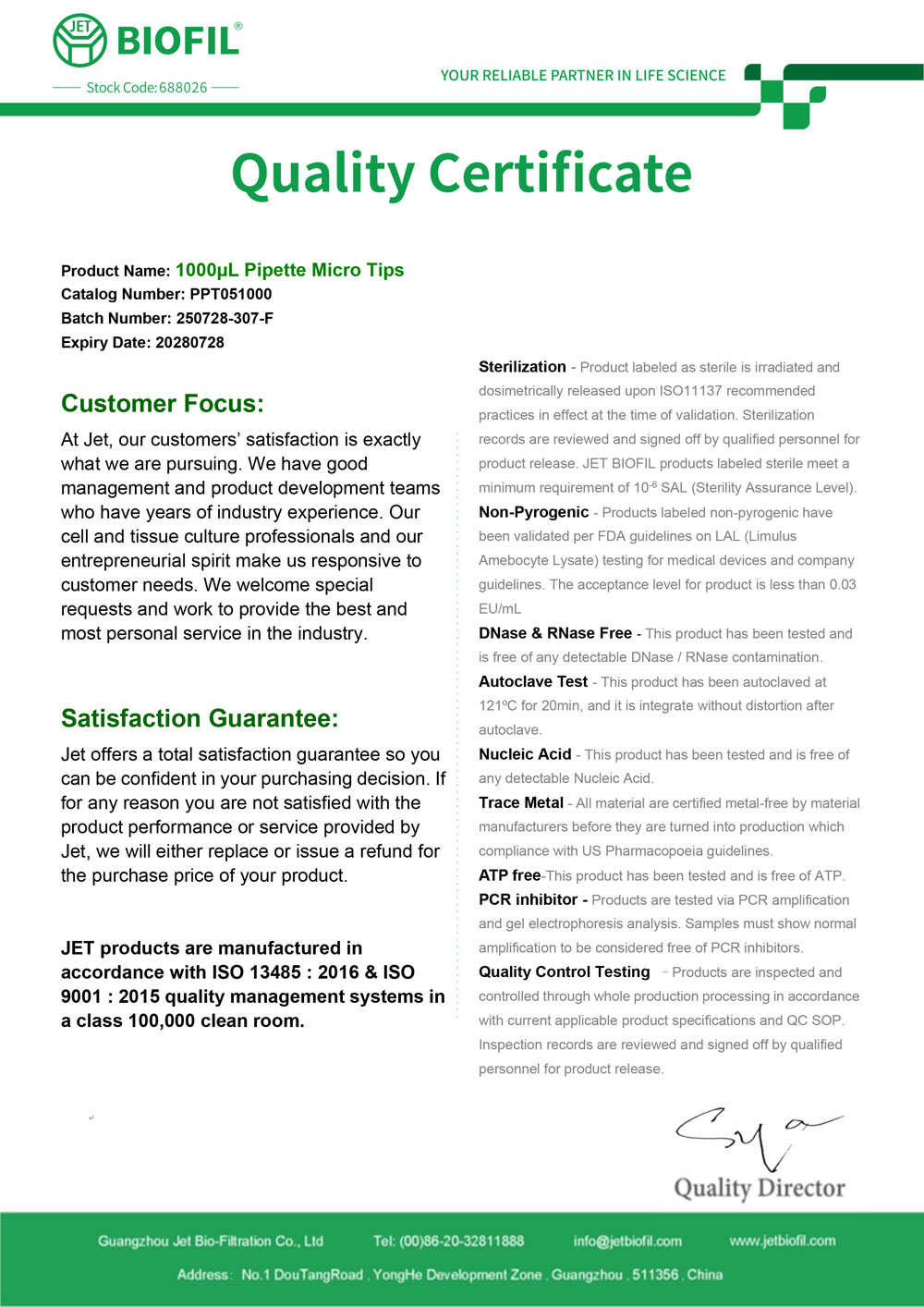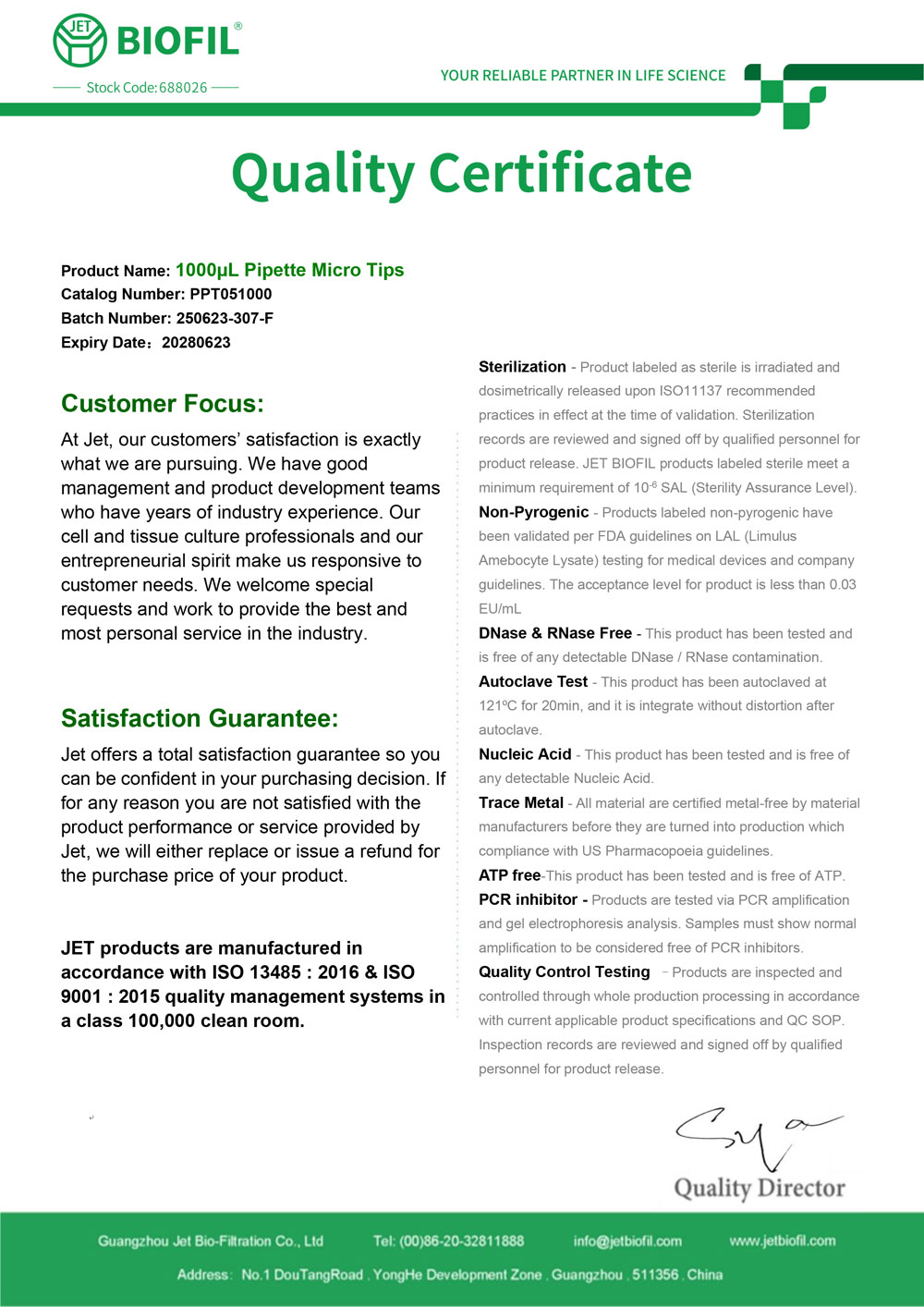 - Сертификат. Наконечник для дозаторов 100-1000 мкл без фильтра, Jet-Bio-Filtration