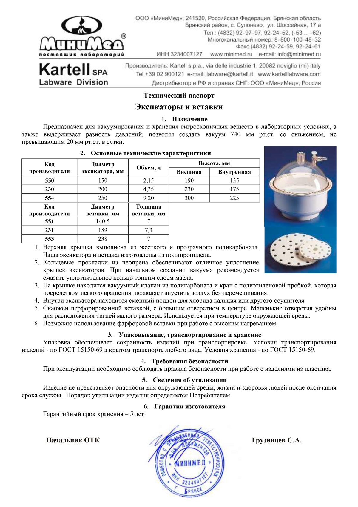 Вставка к эксикатору 150 мм с краном, п/п, Kartell