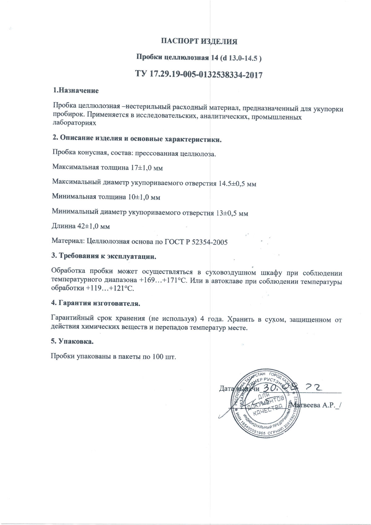 Пробка целлюлозная №14 (13,0-14,5мм) стерилизуемая, автоклавируемая, газопроницаемая, РП-064, уп.100шт.
