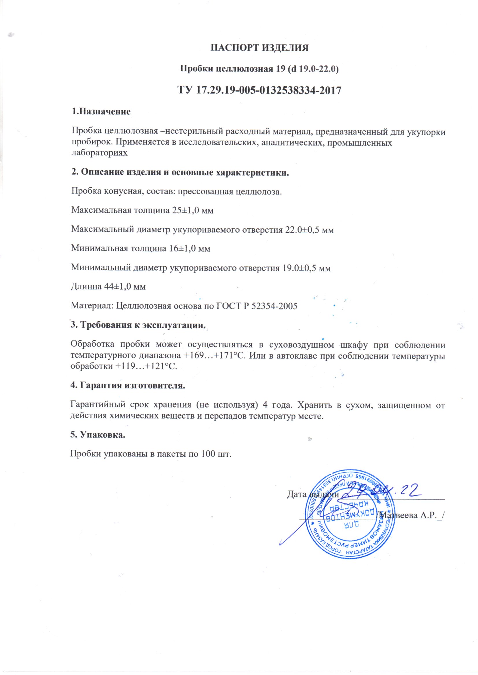 Пробка целлюлозная №19 (19,0-22,0мм) стерилизуемая, автоклавируемая, газопроницаемая, РП-076, уп.100шт.
