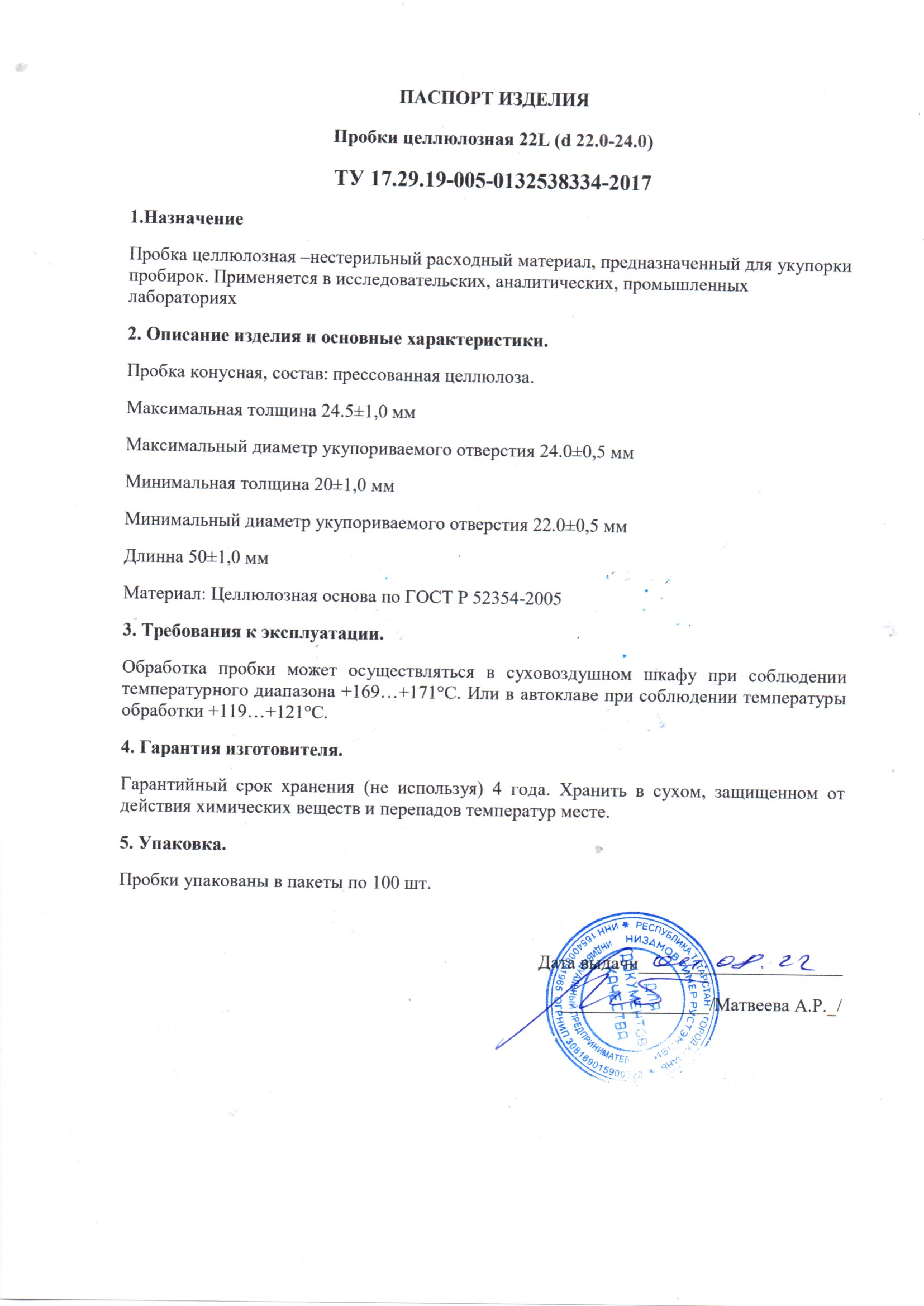 Пробка целлюлозная №22L(22,0-24,0мм) стерилизуемая, автоклавируемая, газопроницаемая, РП-078, уп.100шт.