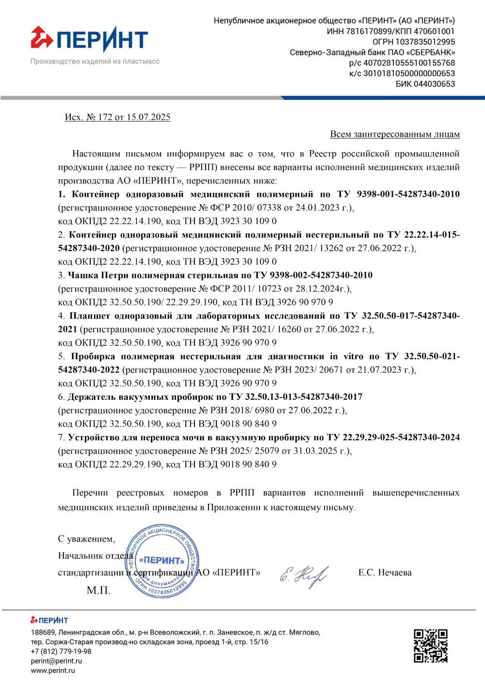 - Реестровые номера из РРПП на Медицинские изделия АО Перинт. Инф. письмо-2
