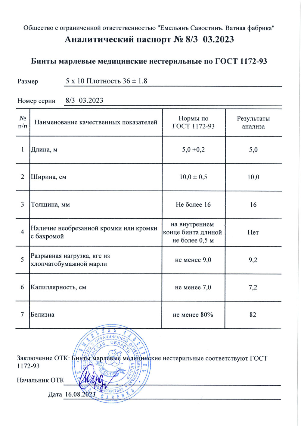 - Бинт марлевый медиц. нестерильный 5х10, п. 8-3 от 03.2023