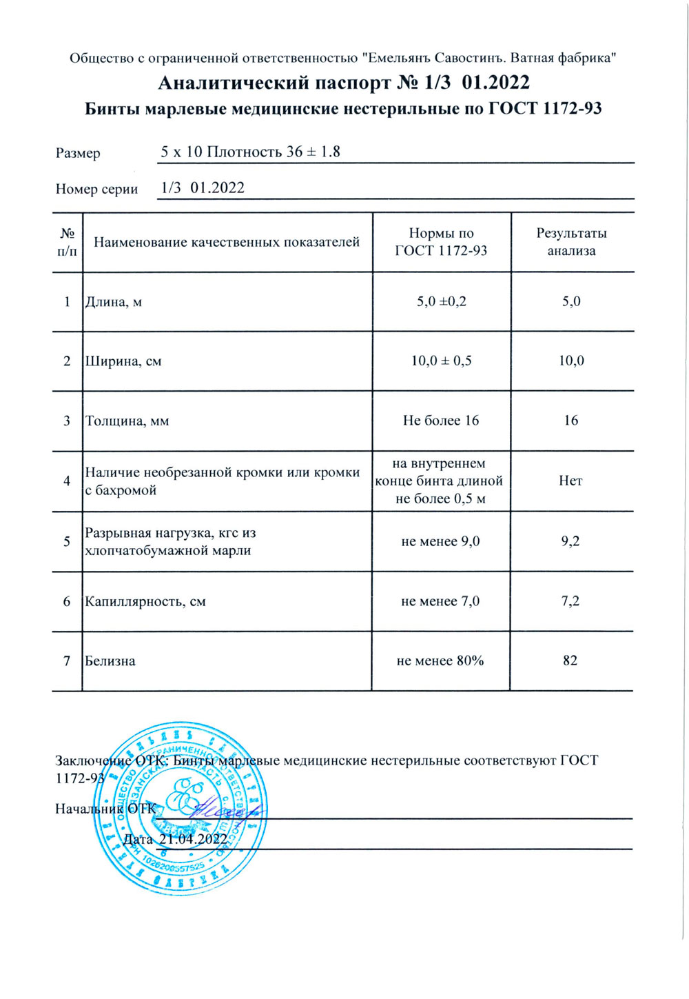 - Бинт марлевый медиц. нестерильный 5х10, п. 1-3 от 01.2022