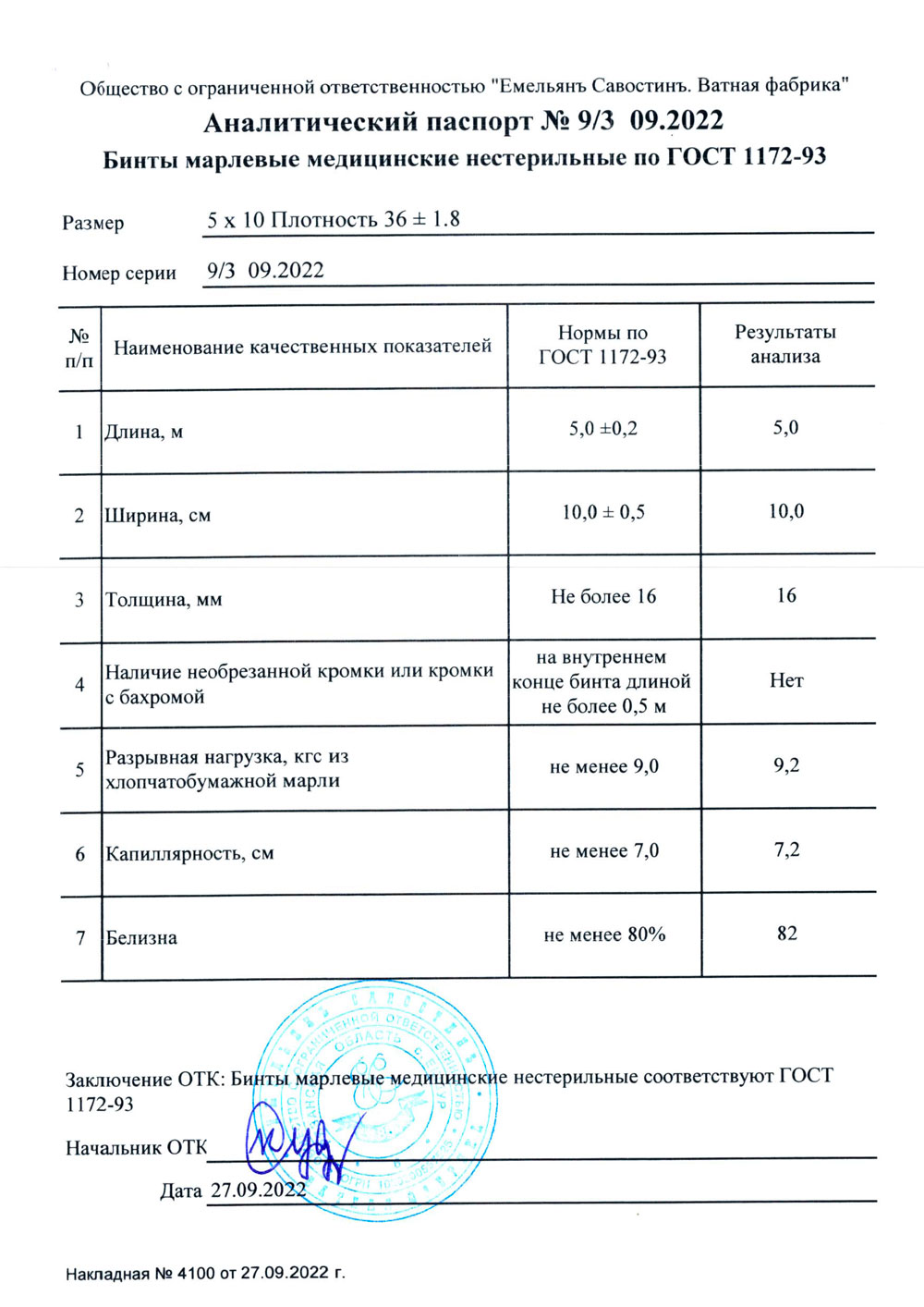 - Бинт марлевый медиц. нестерильный 5х10, п. 9-3 от 09.2022