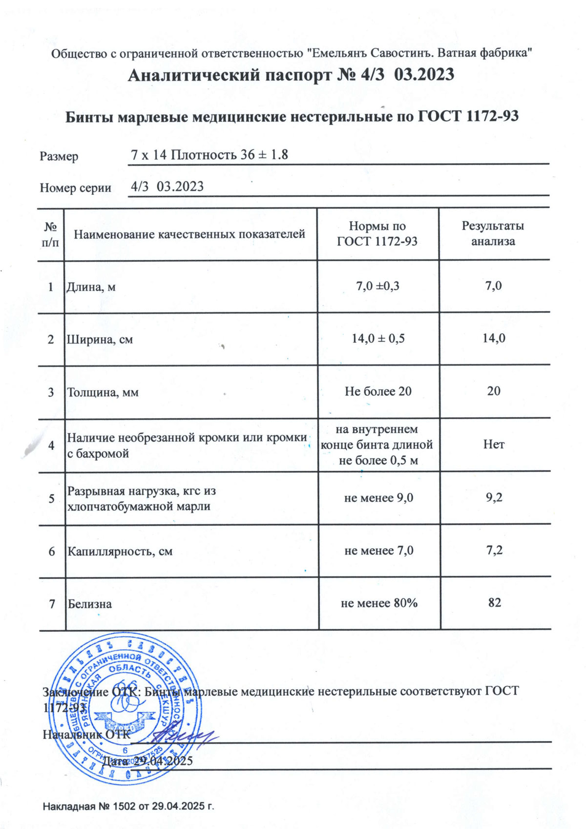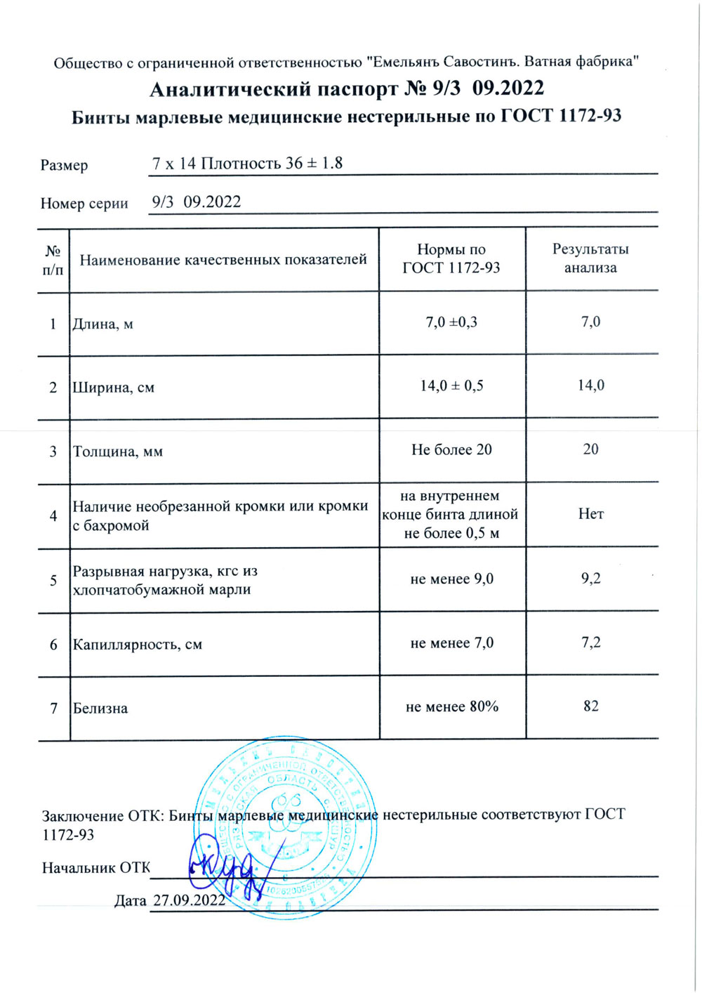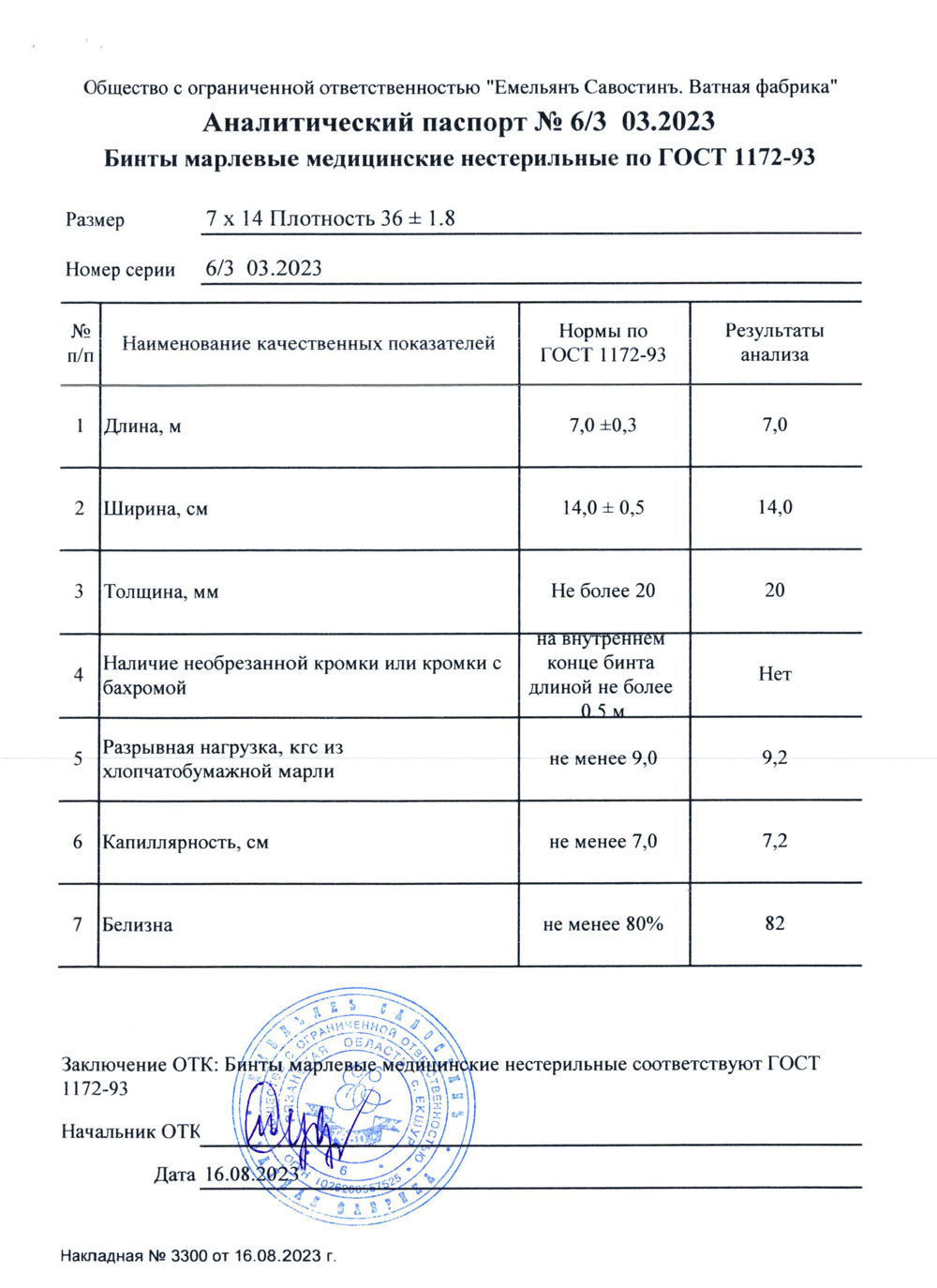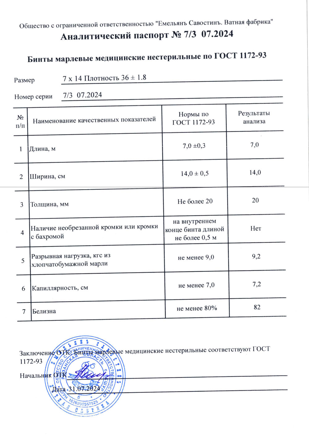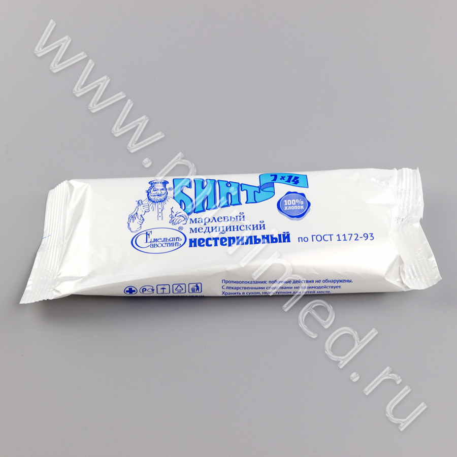 Бинт марлевый медицинский 7*14 нестерильный, инд.уп., плотность 36г/кв.м. ГОСТ 1172-93