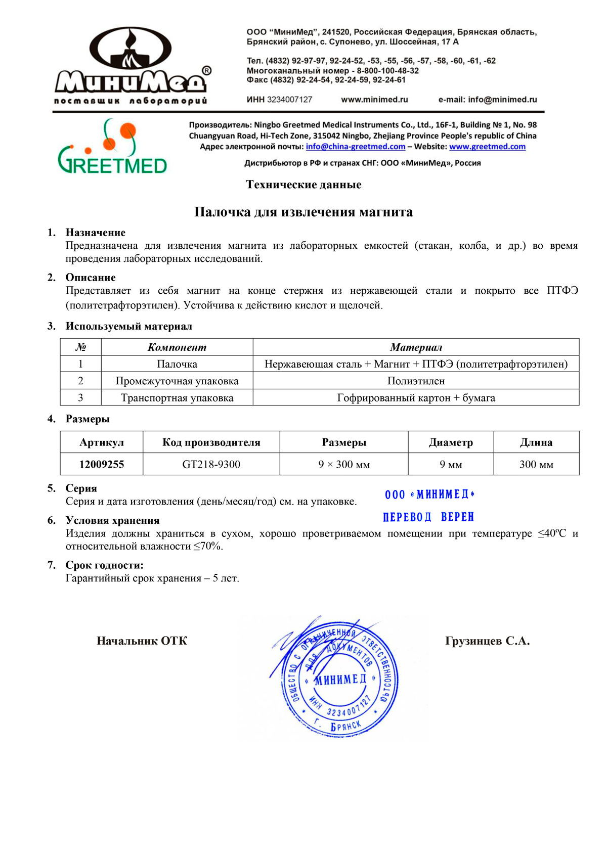 Палочка для извлечения магнитов 9*300 мм, магнит с покрытием из ПTФЭ, инд.уп./10/250 шт