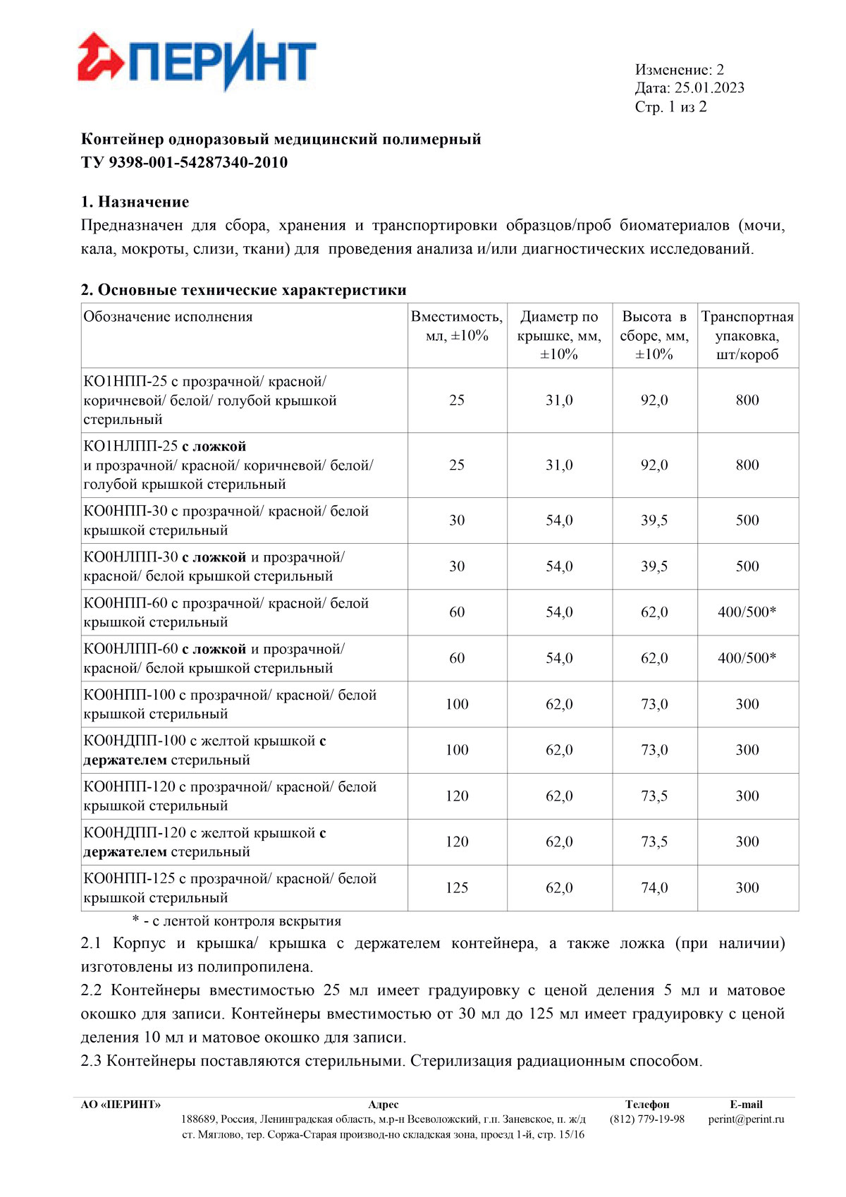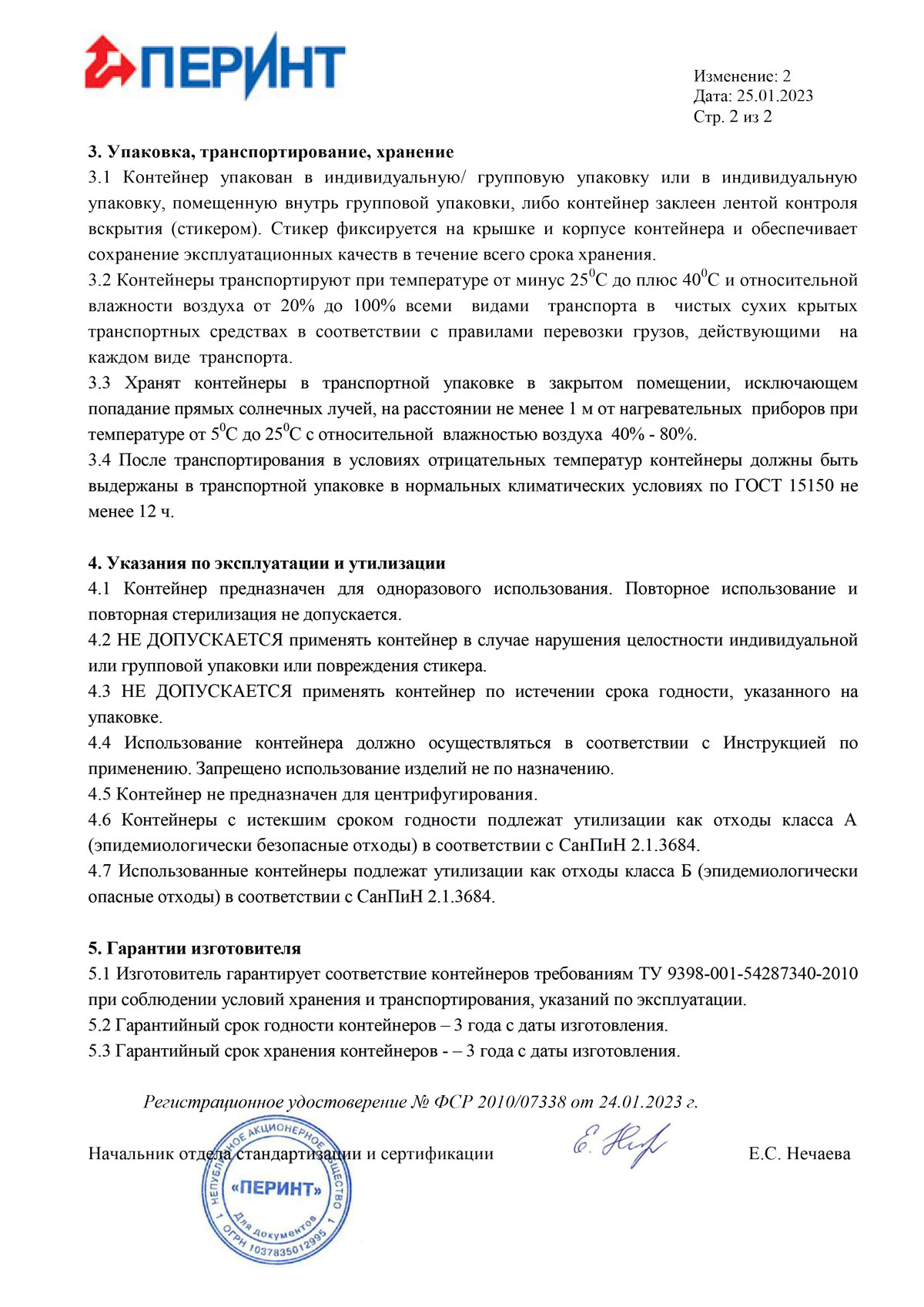 - Контейнер одноразовый медицинский полимерный. ПЕРИНТ. РУ-2023-2