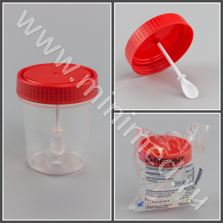 Контейнер с завинчивающейся крышкой обеспечивает полную герметичность при транспортировке биологического материала. Крышка снабжена ложкой. Изготовлен из ультрачистого полипропилена. Имеет градуировку и матовое окошко для записи. Стерильный.