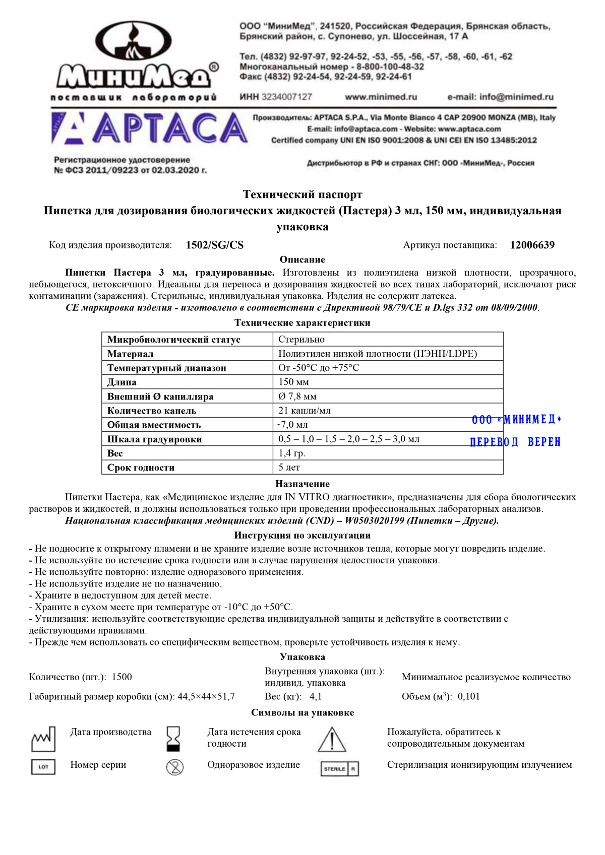 Пипетка для дозирования биологич. жидкости (Пастера) 3 мл.стер.,150 мм, п/эт, инд.уп, уп.1500 шт, Аптака