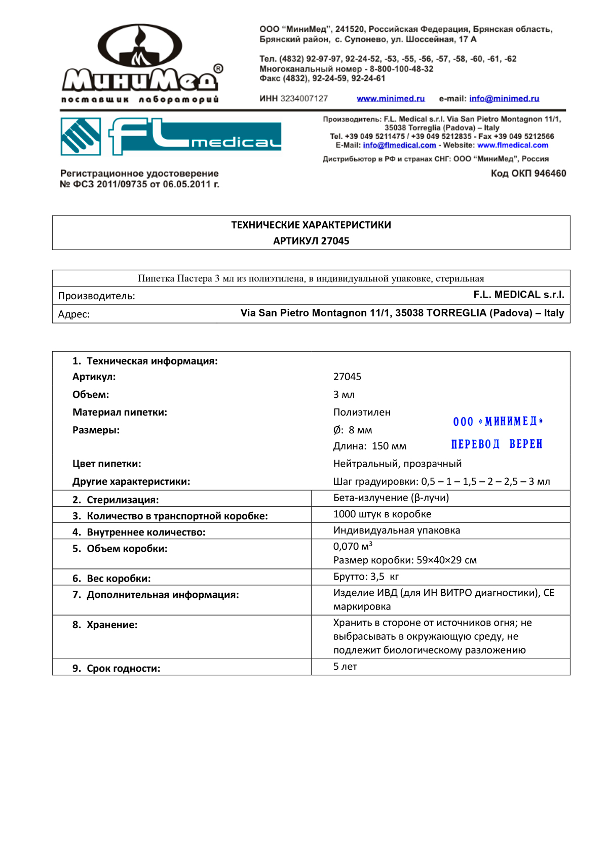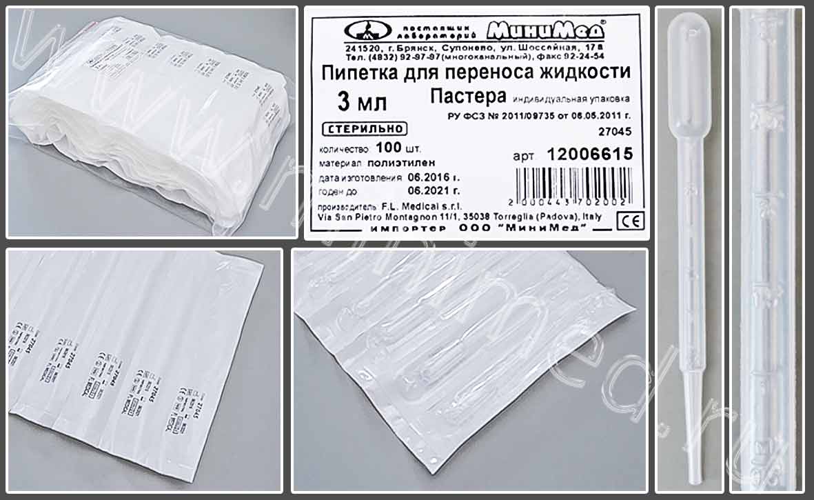 Пипетка для переноса жидкости (Пастера) 3 мл.стер, п/эт, инд.уп, уп.100 шт, FL medical