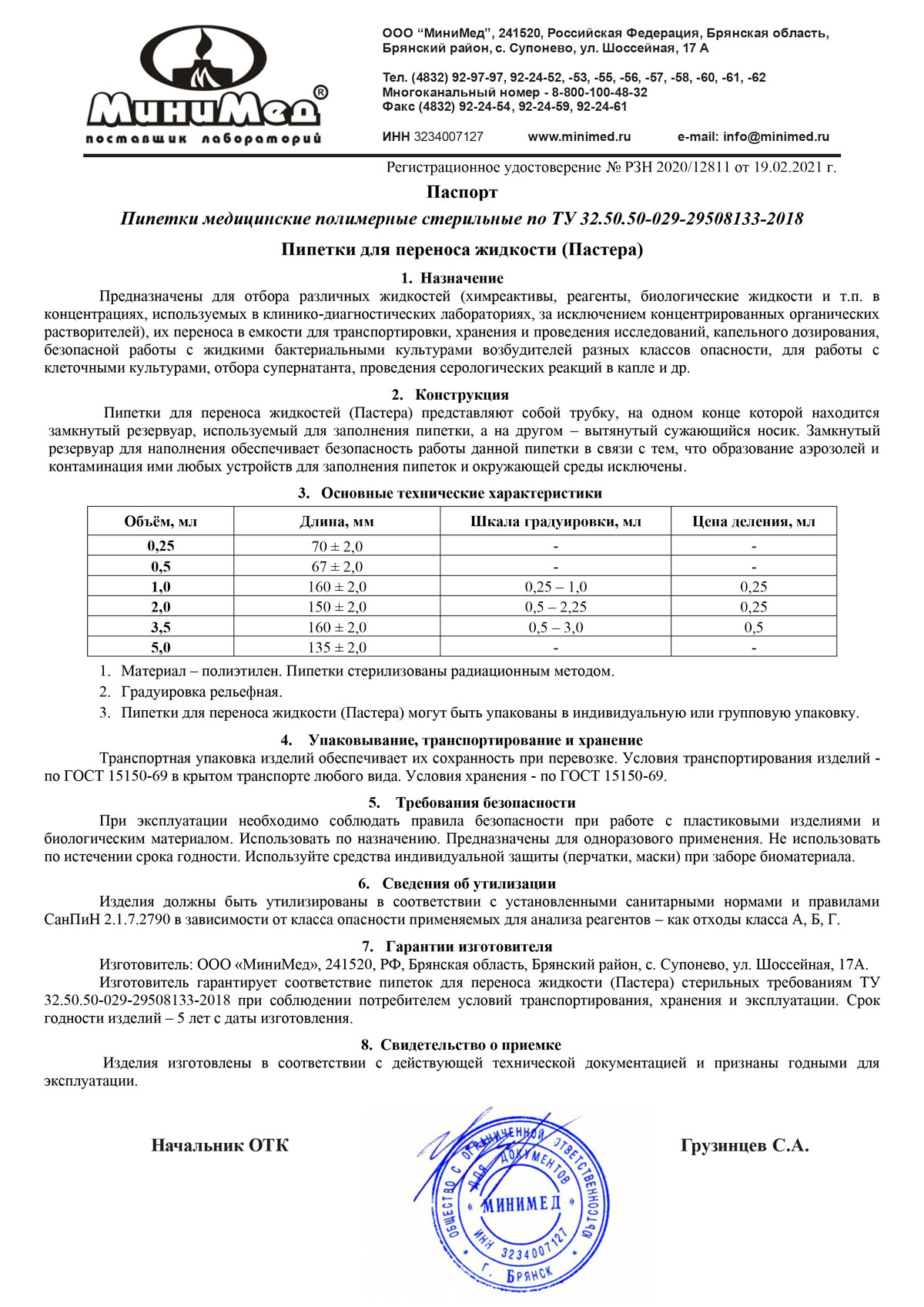 - Пипетки для переноса жидкости (Пастера), стерильные. МиниМед. Паспорт