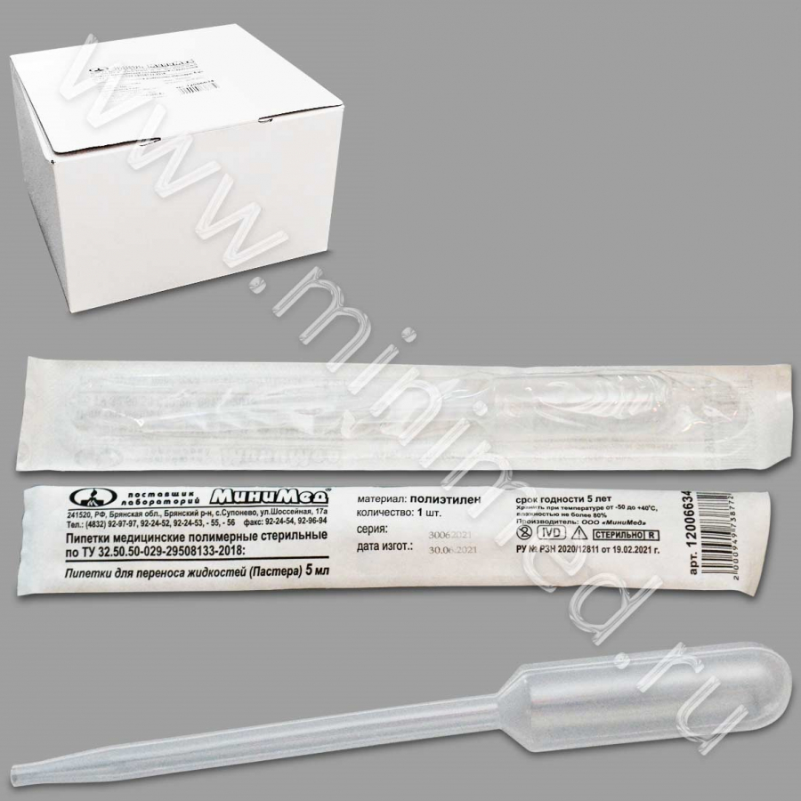 Пипетка для переноса жидкостей (Пастера) 5 мл, стер, без шкалы, ТУ 32.50.50-029-29508133-2018, инд.уп, уп.100 шт, МиниМед