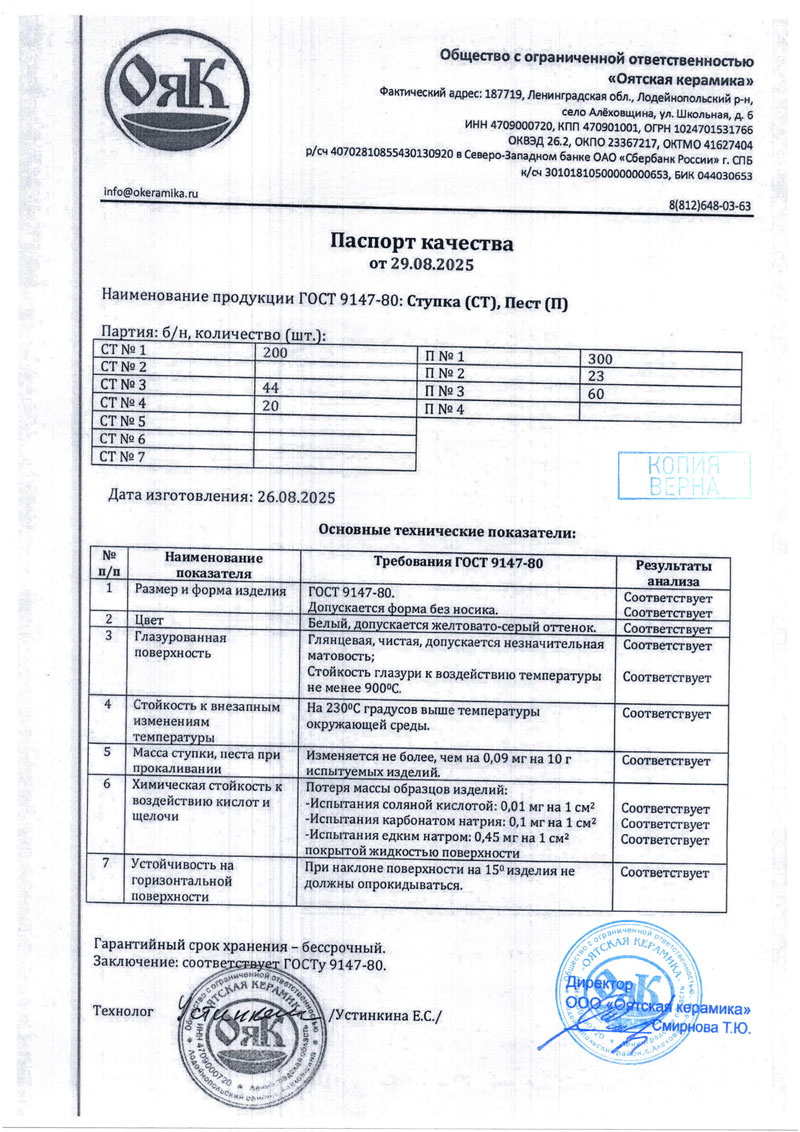 - Ступка, Пест. Паспорт качества от 29.08.2025