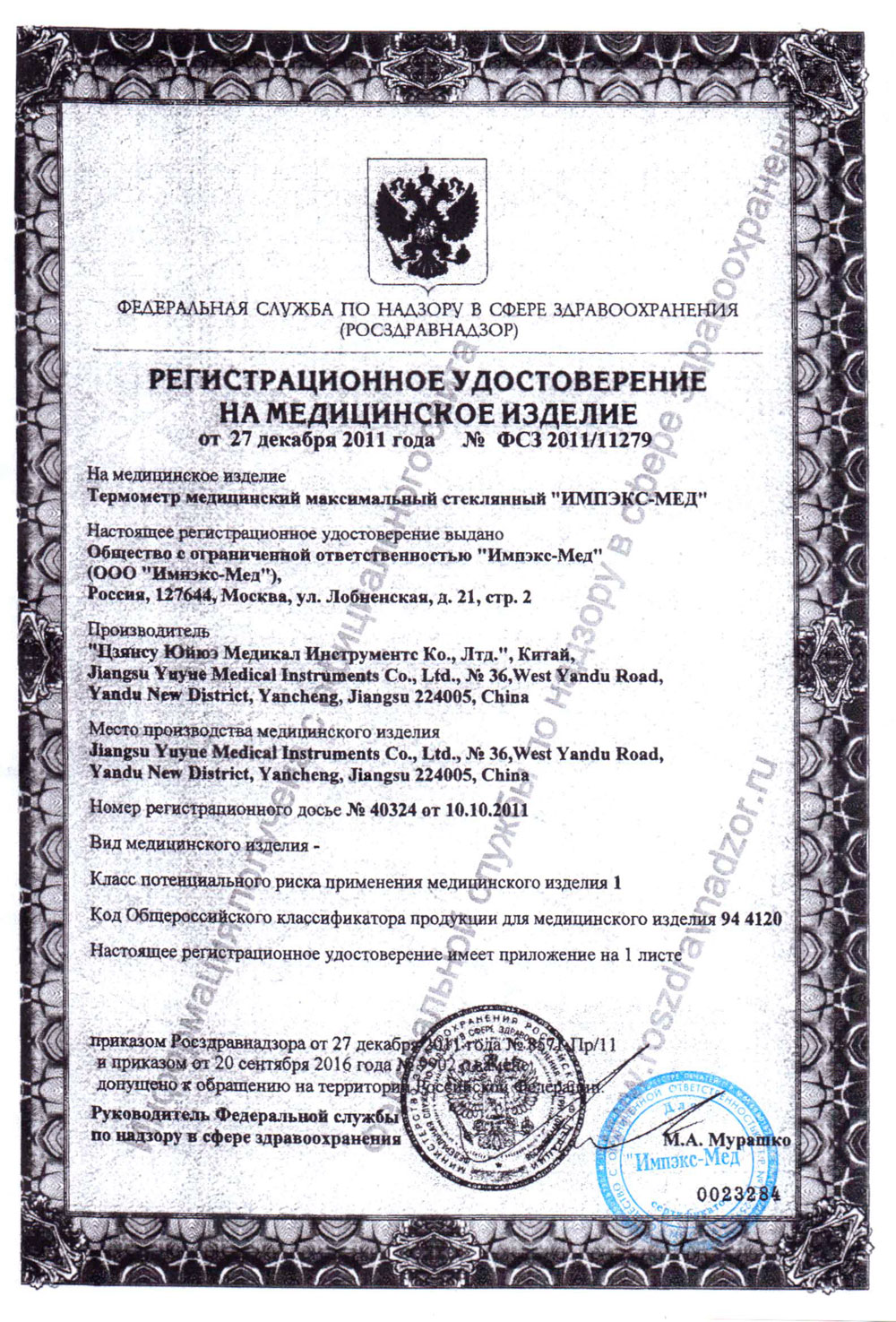 РУ № ФСЗ 2011/11279 от 27.12.2011 г.