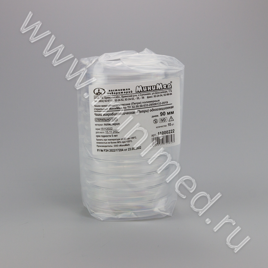 Чашка микробиологическая (Петри) полимерная Ø 90 мм стерильная МиниМед по ТУ 32.50.50-033-29508133-2019, п/с, уп.10/500 шт