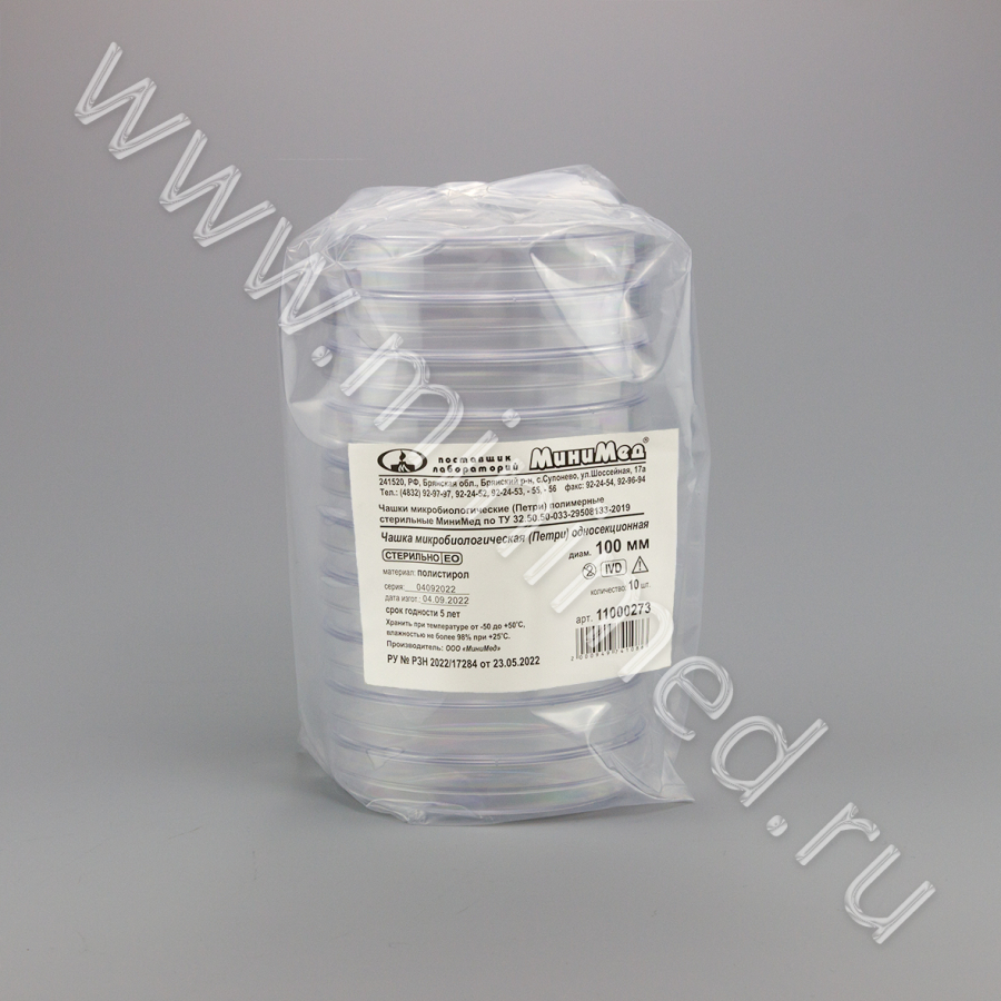 Чашка микробиологическая (Петри) полимерная Ø 100 мм стерильная МиниМед по ТУ 32.50.50-033-29508133-2019, п/с, уп.10/500 шт