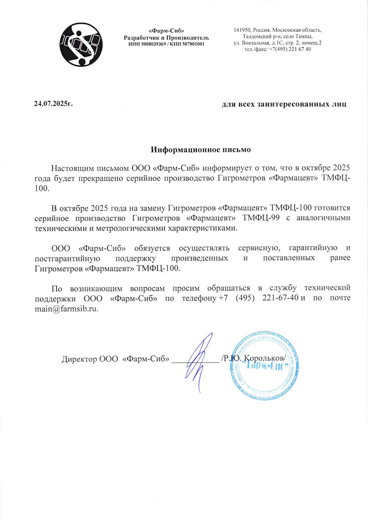- Гигрометры Фармацевт. ООО Фарм-Сиб. Письмо о рекращение производства