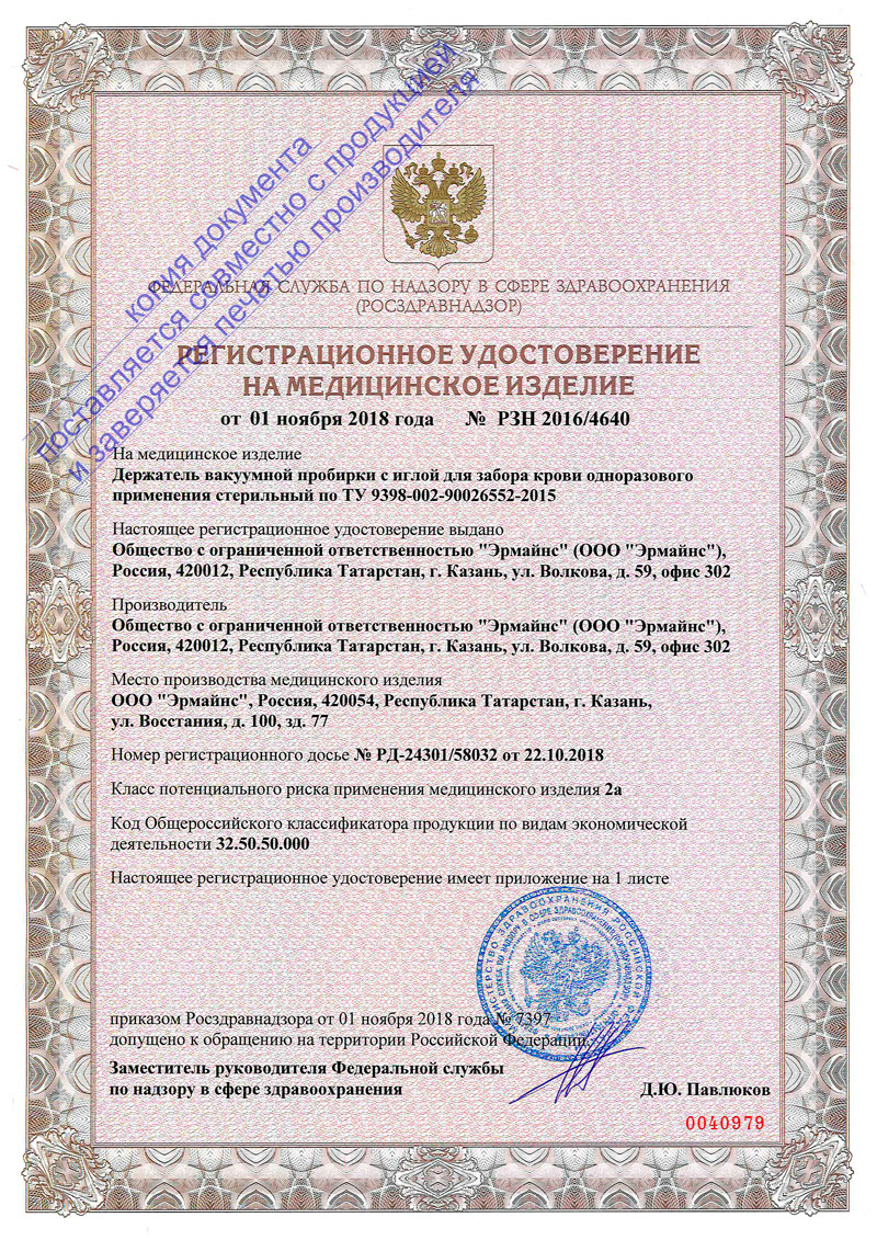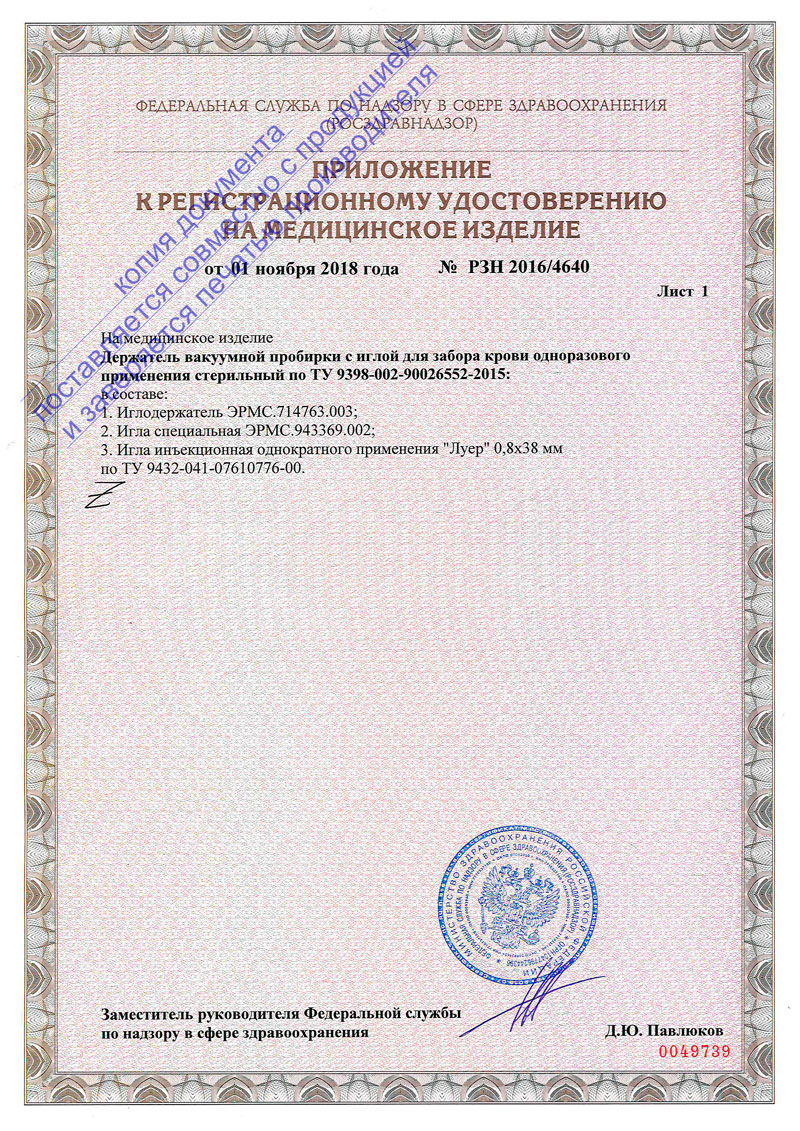 - Держатель вакуумной пробирки с иглой стер. ООО Эрмайнс. Выписка из РРПП до 06.10