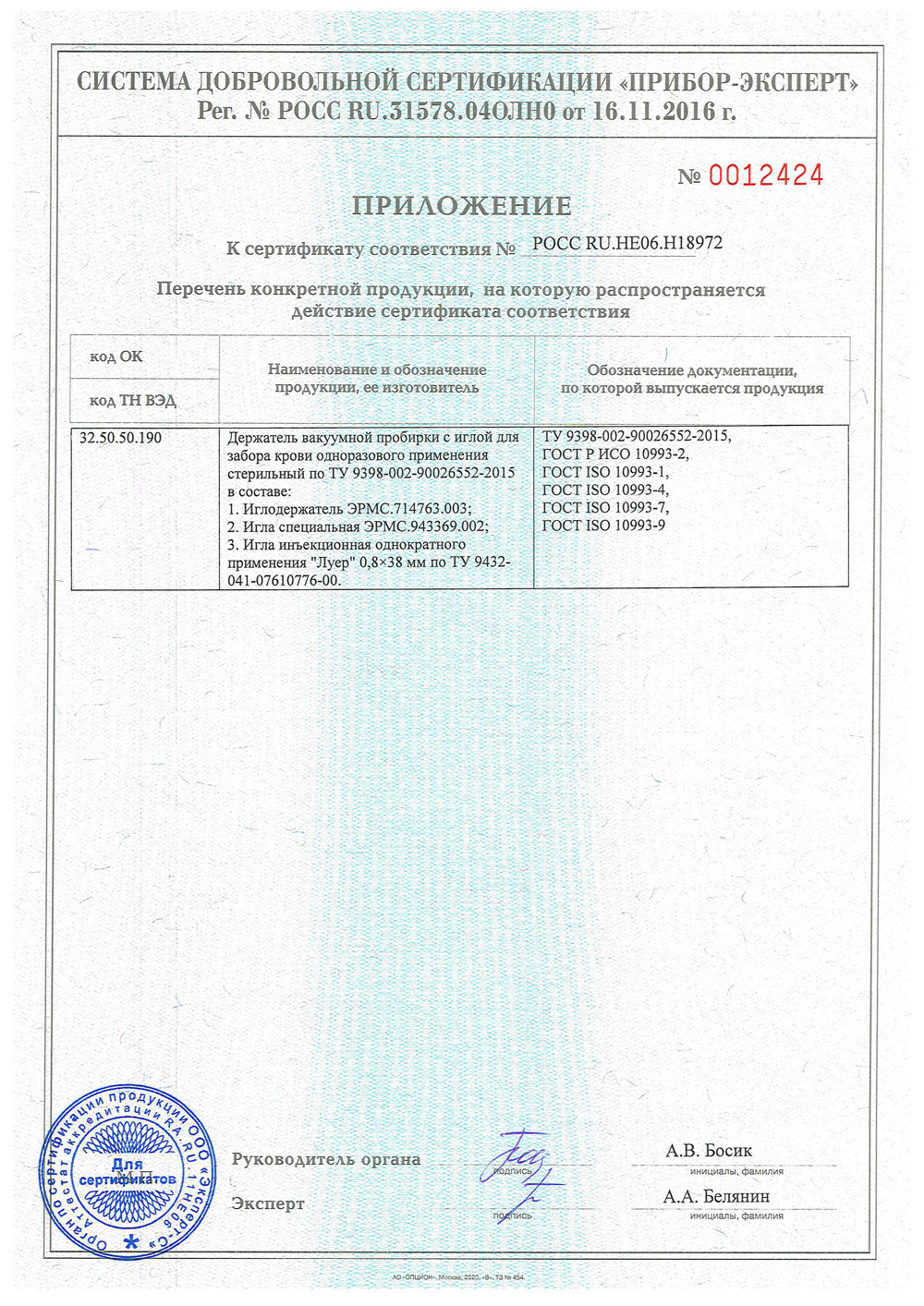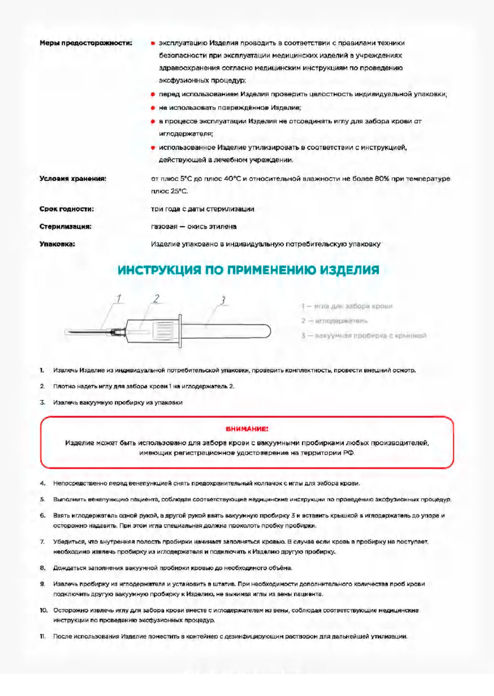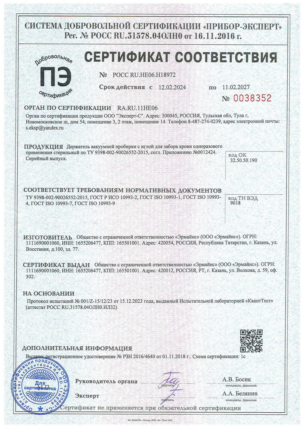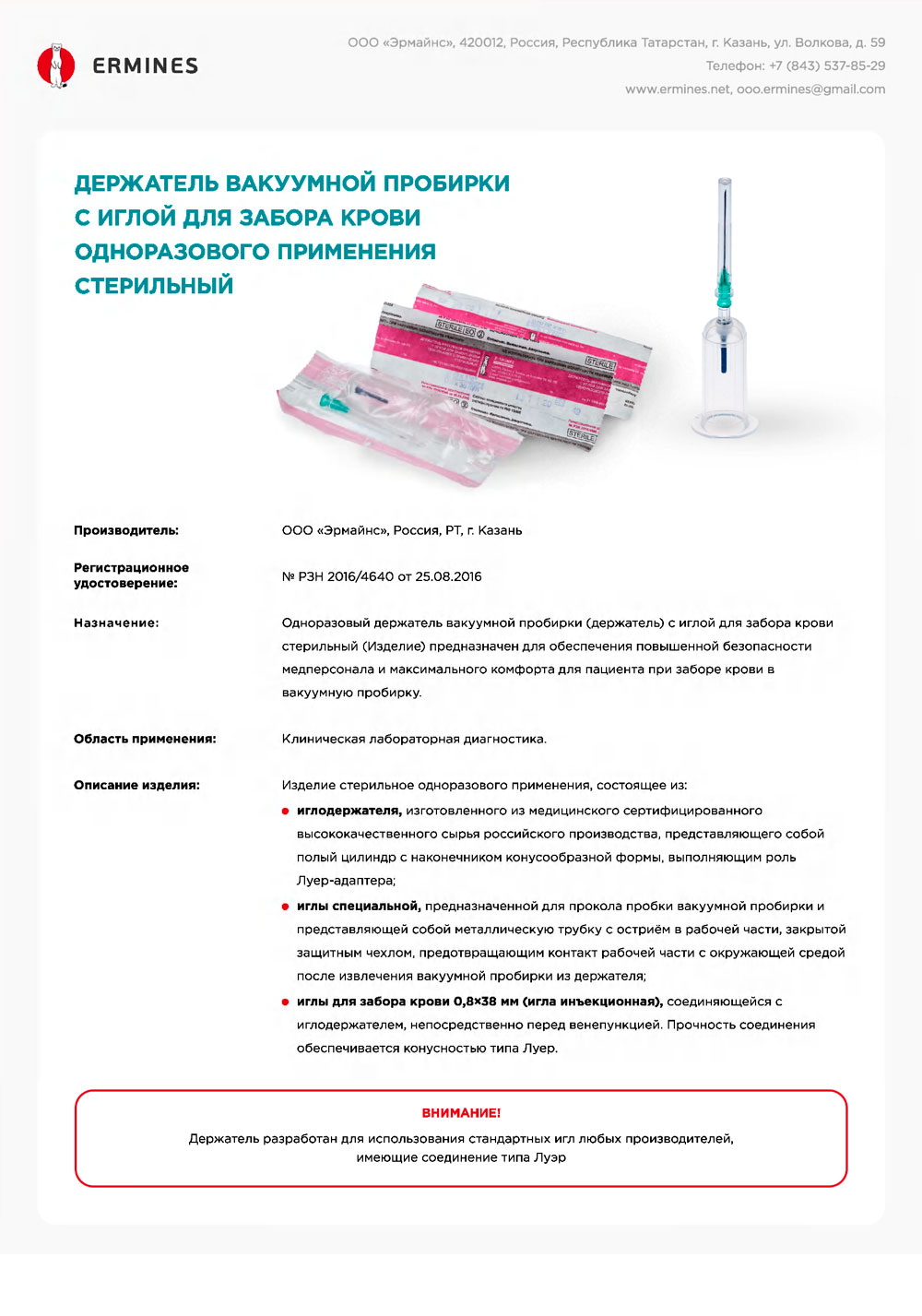 - Держатель вакуумной пробирки с иглой для забора крови стер. ООО Эрмайнс. Сертифи