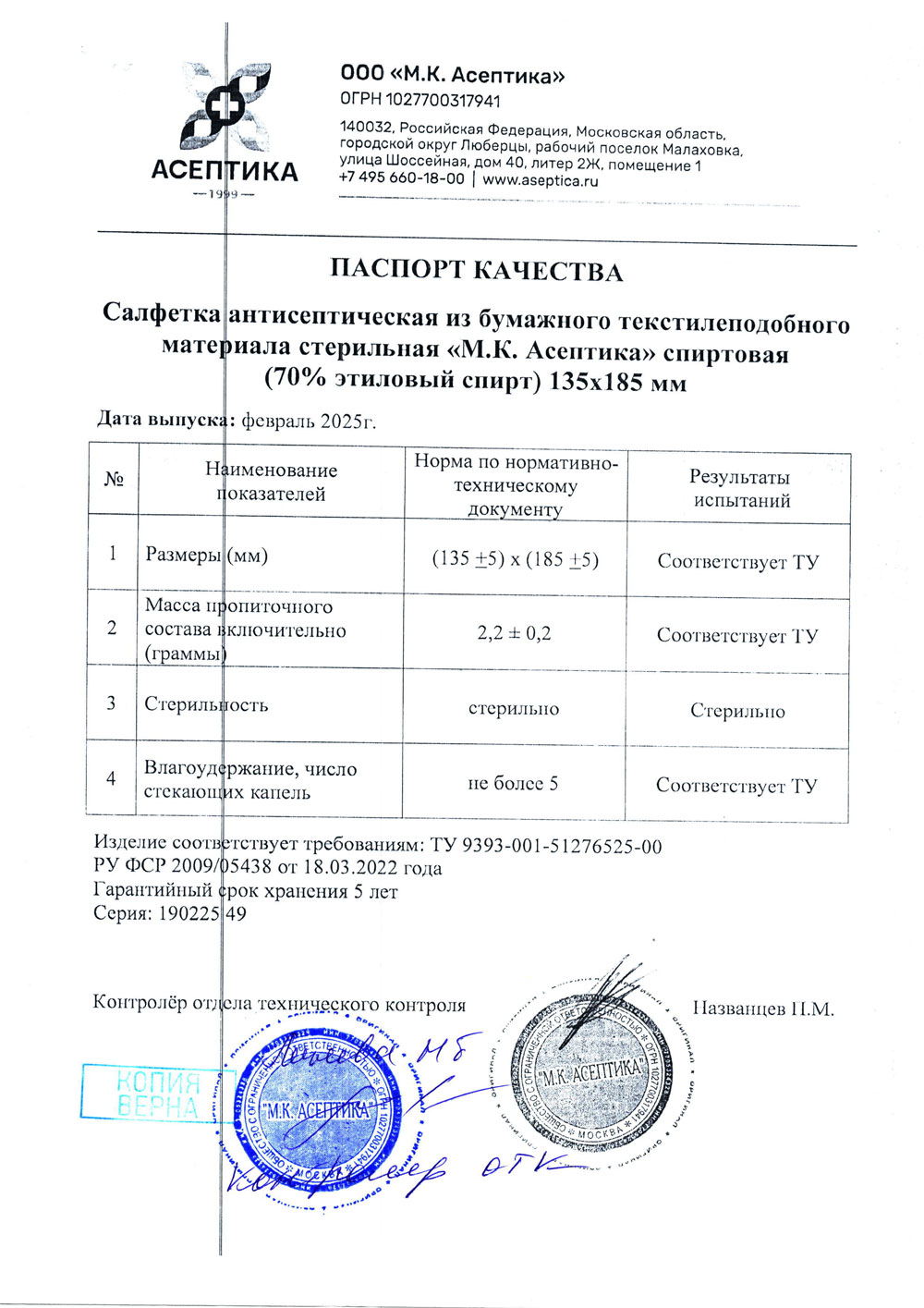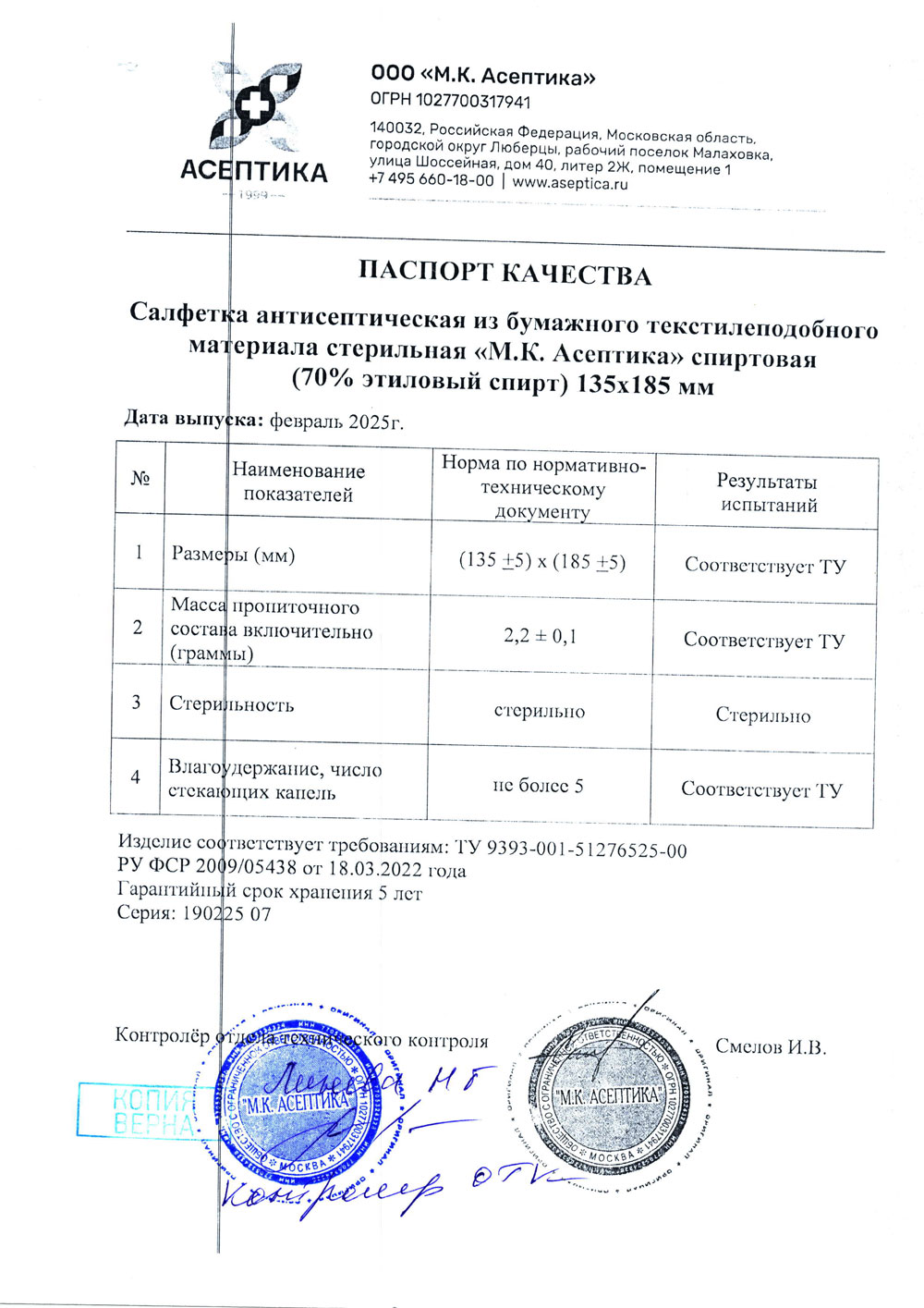 - Салфетки антисептические стерильные спиртовые М.К. Асептика. РУ 2022-3