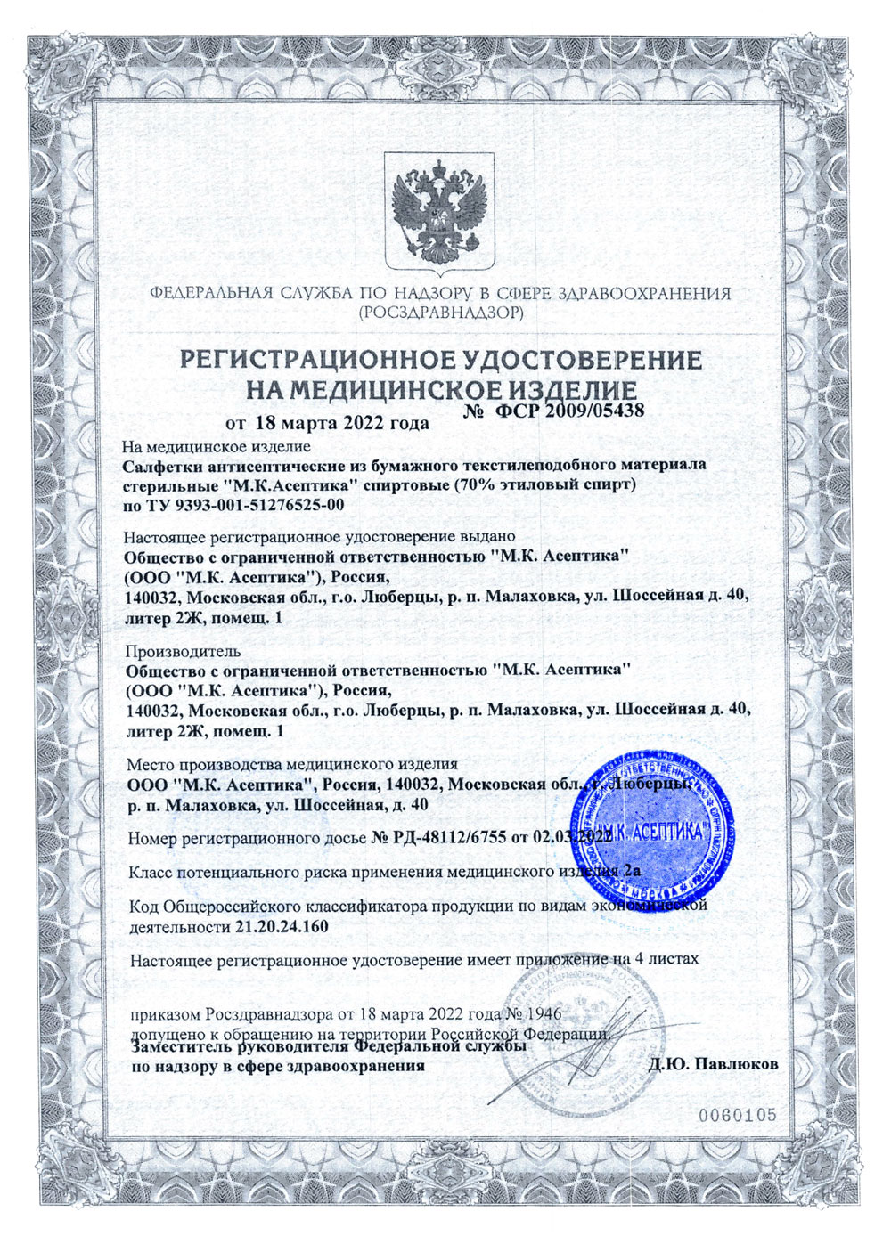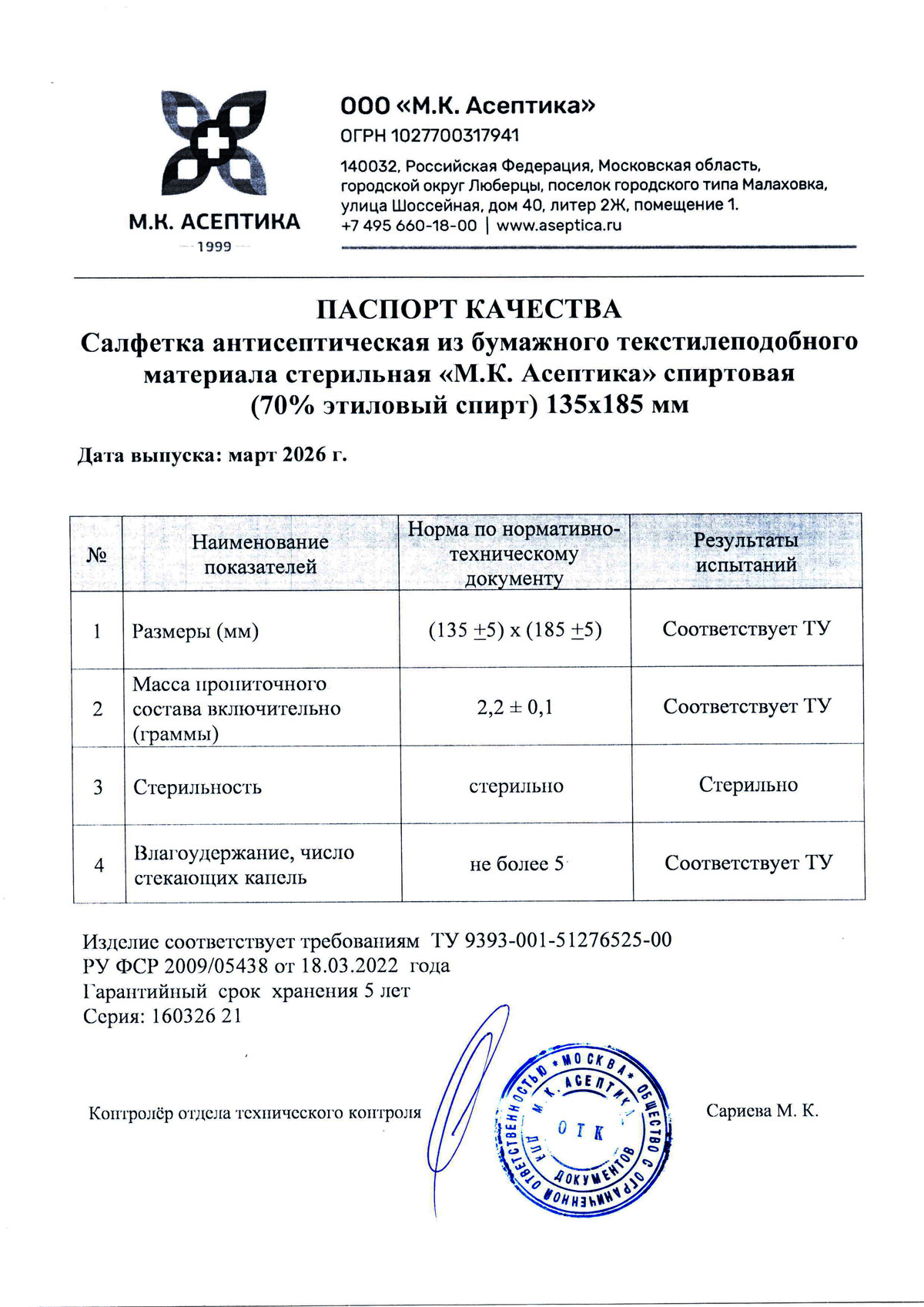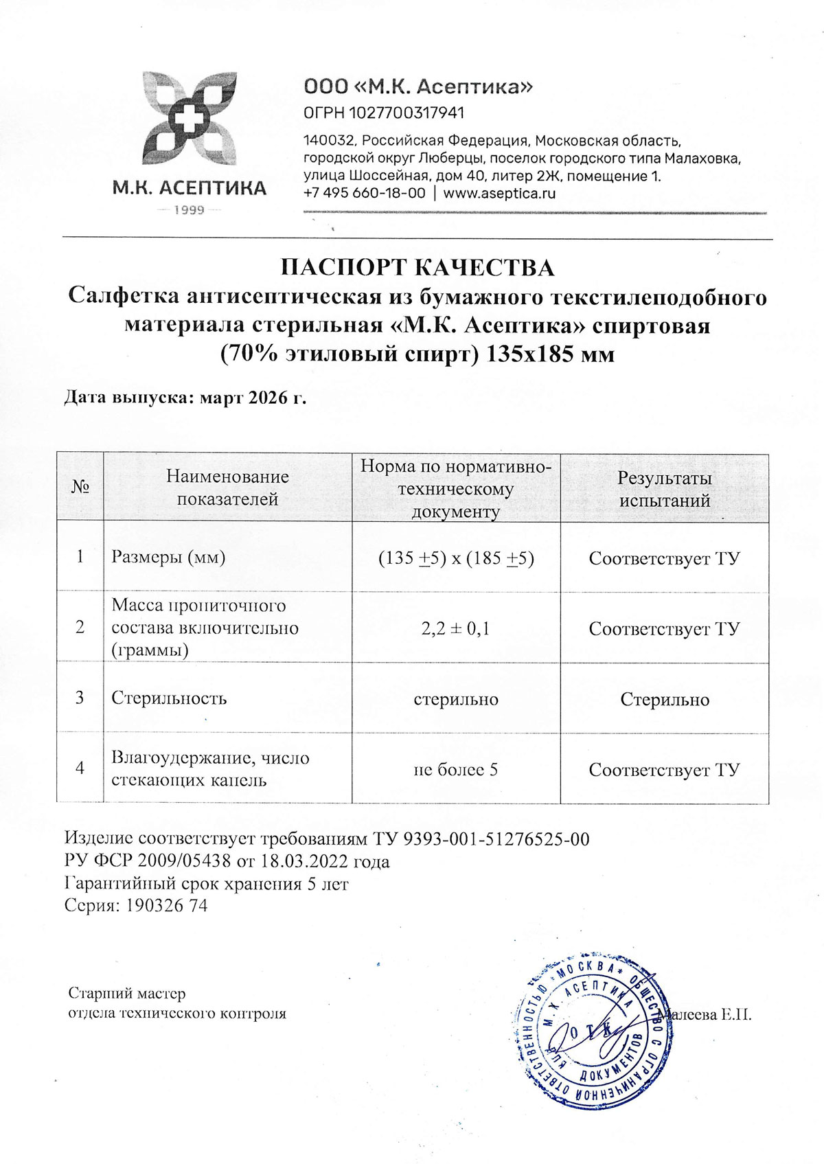 - Салфетки антисептические стерильные спиртовые М.К. Асептика. РУ 2022-4