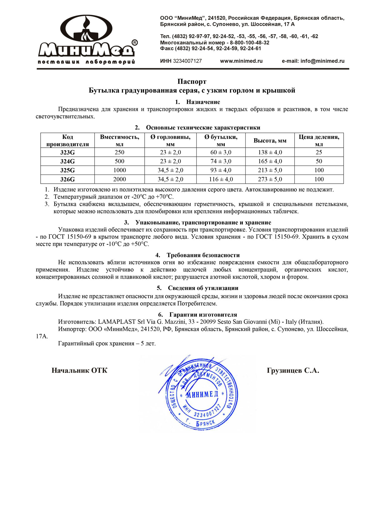 Бутылка снабжена вкладышем, обеспечивающим герметичность, и специальными петельками, которые можно использовать для пломбировки или крепления информационных табличек. Устойчива к действию щелочей любых концентраций, органических кислот, концентрированных соляной и плавиковой кислот; разрушается азотной кислотой, хлором и фтором. Изготовлена из полиэтилена. Автоклавированию не подлежит.
