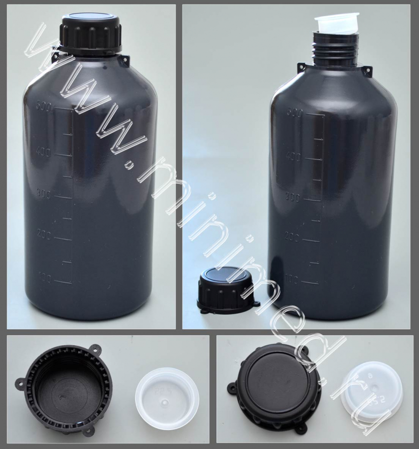 Бутылка снабжена вкладышем, обеспечивающим герметичность, и специальными петельками, которые можно использовать для пломбировки или крепления информационных табличек. Устойчива к действию щелочей любых концентраций, органических кислот, концентрированных соляной и плавиковой кислот; разрушается азотной кислотой, хлором и фтором. Изготовлена из полиэтилена. Автоклавированию не подлежит.