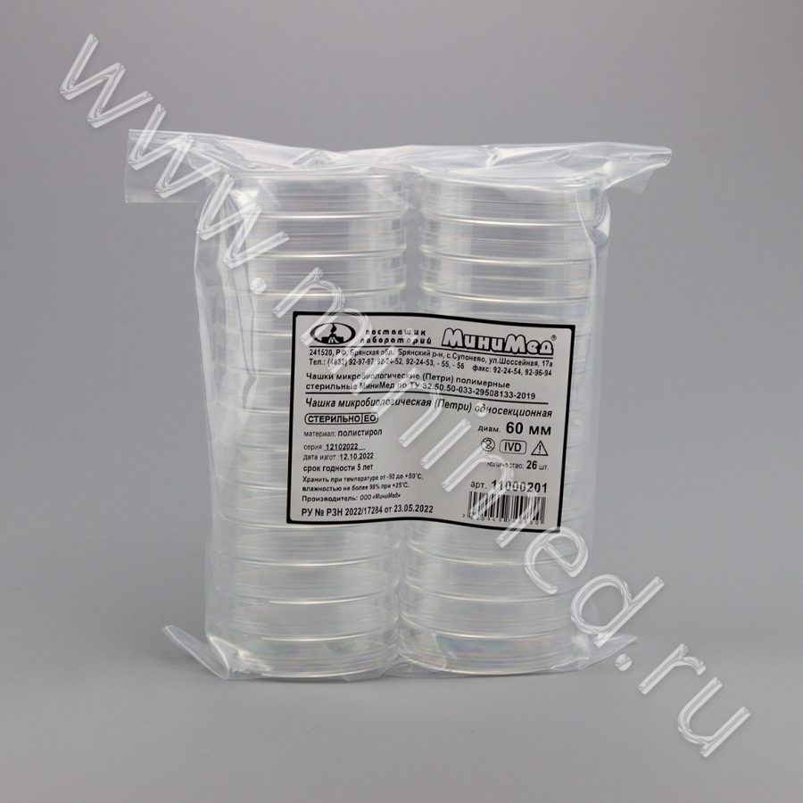Чашка микробиологическая (Петри) полимерная Ø 60 мм стерильная МиниМед по ТУ 32.50.50-033-29508133-2019, п/с, уп.26/1040 шт