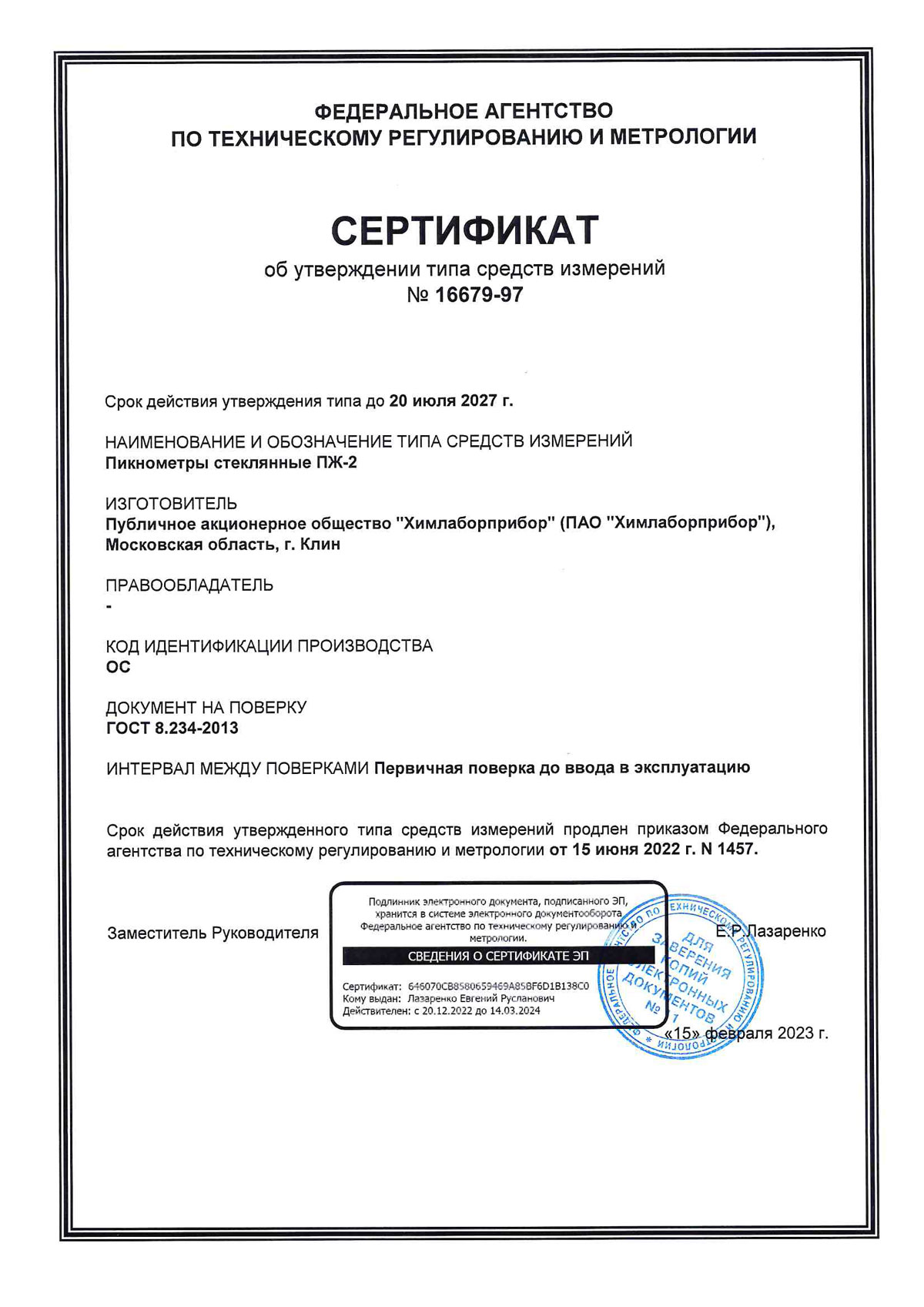 - Пикнометры стеклянные ПЖ-2. Химлаборприбор. Сертификат об утверждении ТСИ до 20.