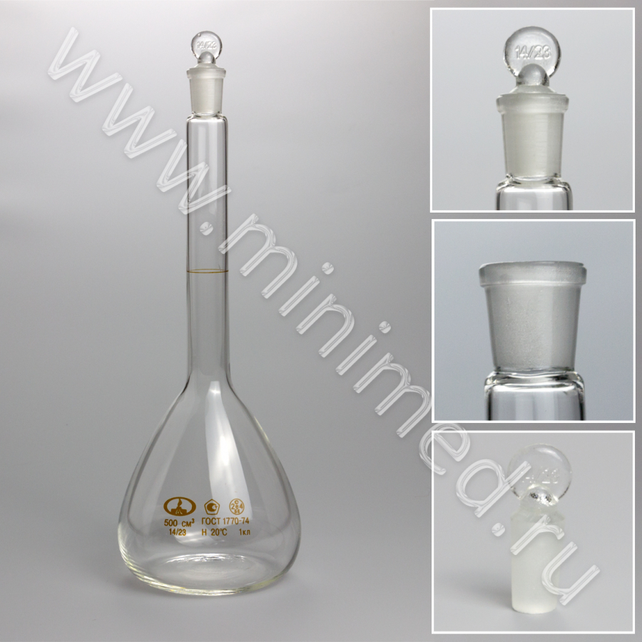 Колба 2-500-1 мерная, с пришлифованной пробкой 14/23, 1 класс, ГОСТ 1770-74, МиниМедПром, инд.уп./32 шт