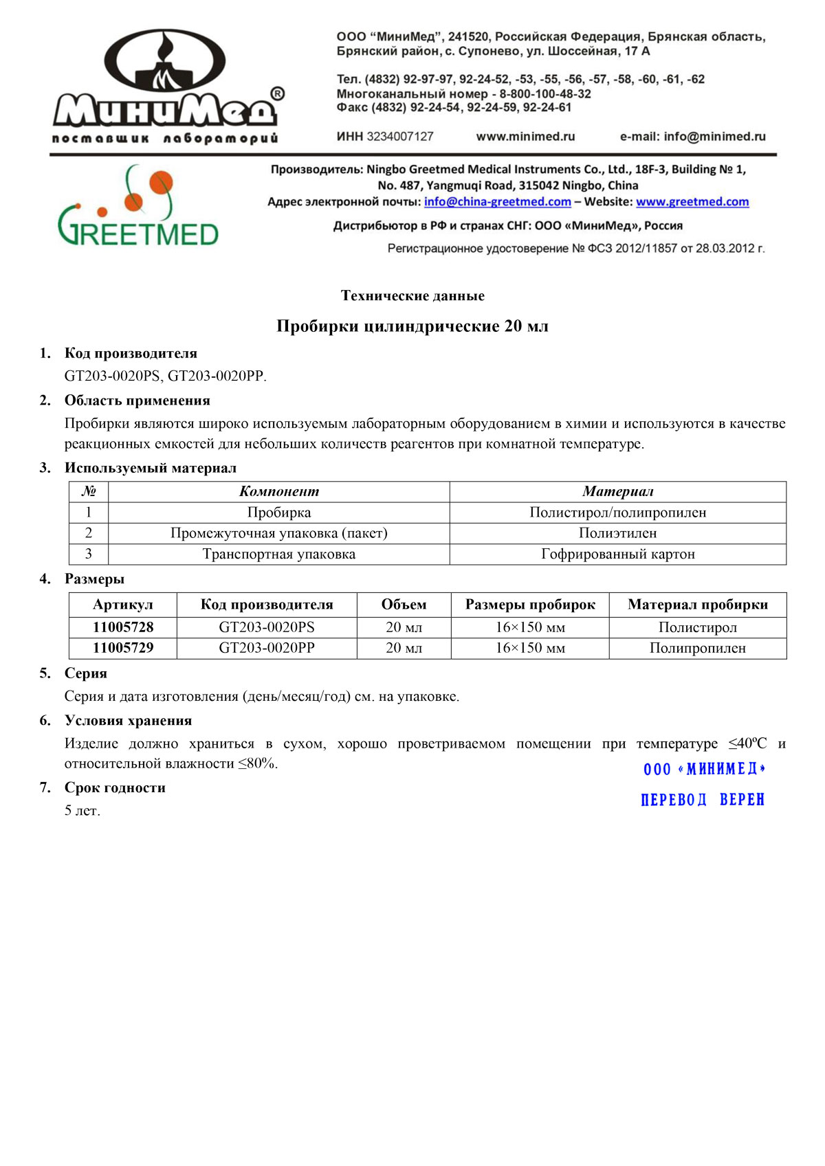 Пробирка 20 мл цилиндрическая, 16×150 мм, п/п, уп.100/2000 шт, Гритмед