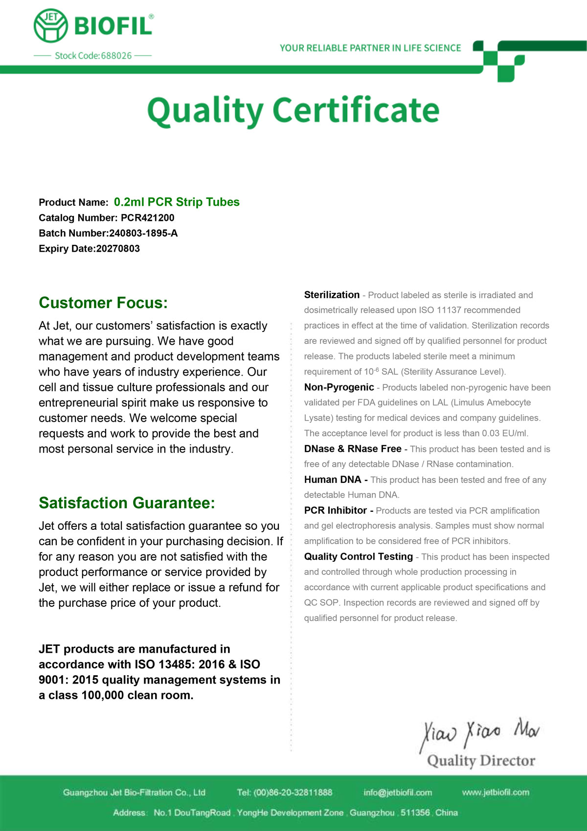 - Сертификат. Микропробирка 0,2 мл, тип Эппендорф, в стрипах, Jet Bio-Filtration P