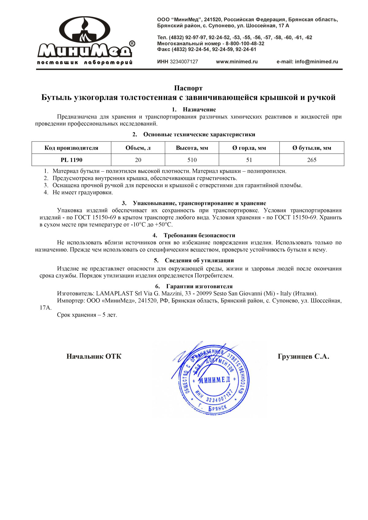 Бутыль толстостенная 20 л с узким горлом, с крышкой, ПЭНД, LAMAPLAST, шт