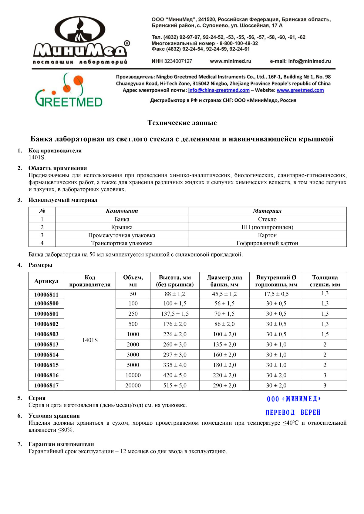 Предназначена для хранения химических реактивов. Изготовлена из химико-лабораторного стекла, крышка изготовлена из полипропилена. На горлышке есть уплотнительное кольцо. Градуированы до 900 мл.