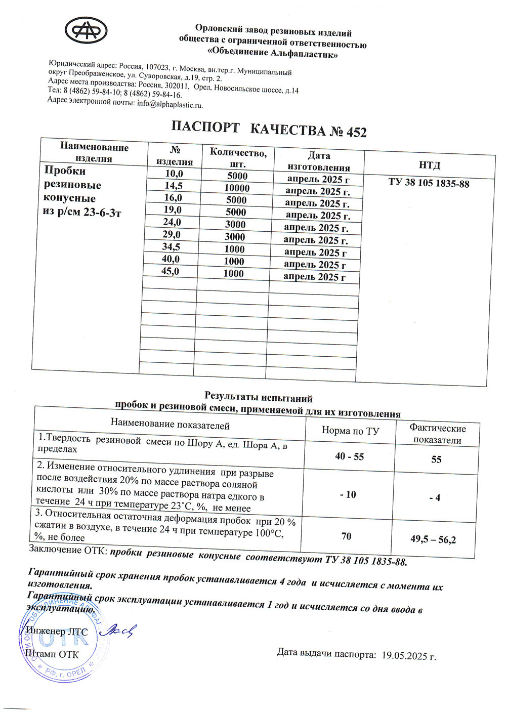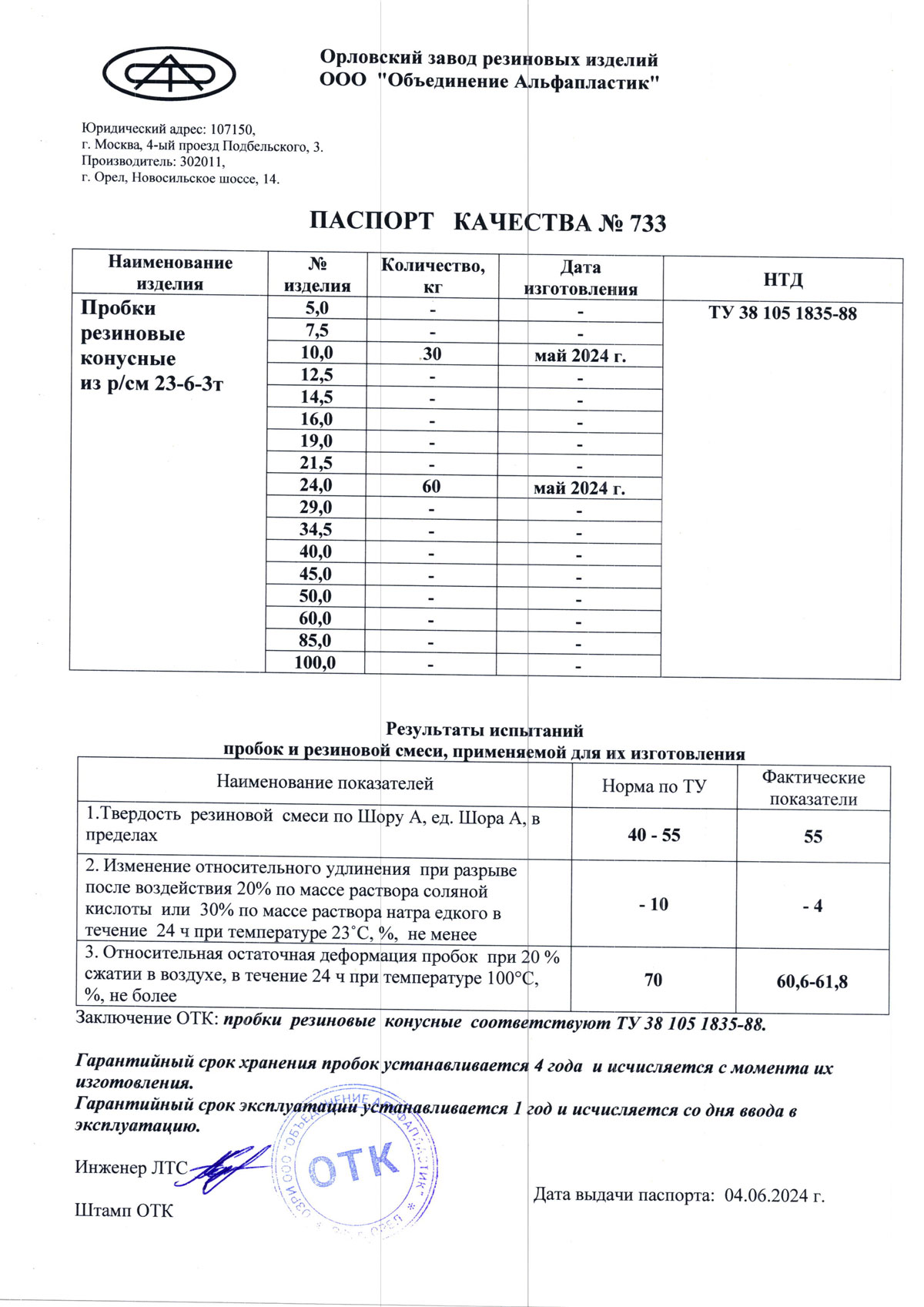 - Пробки резиновые конусные. Объединение Альфапластик. Сертификат до 29.08.2027
