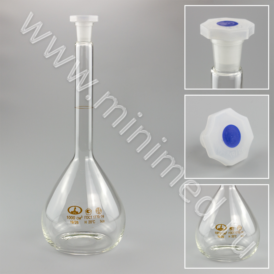 Колба 2а-1000-1 мерная, с пробкой, 1 класс, ГОСТ 1770-74, МиниМедПром, инд.уп./24 шт,