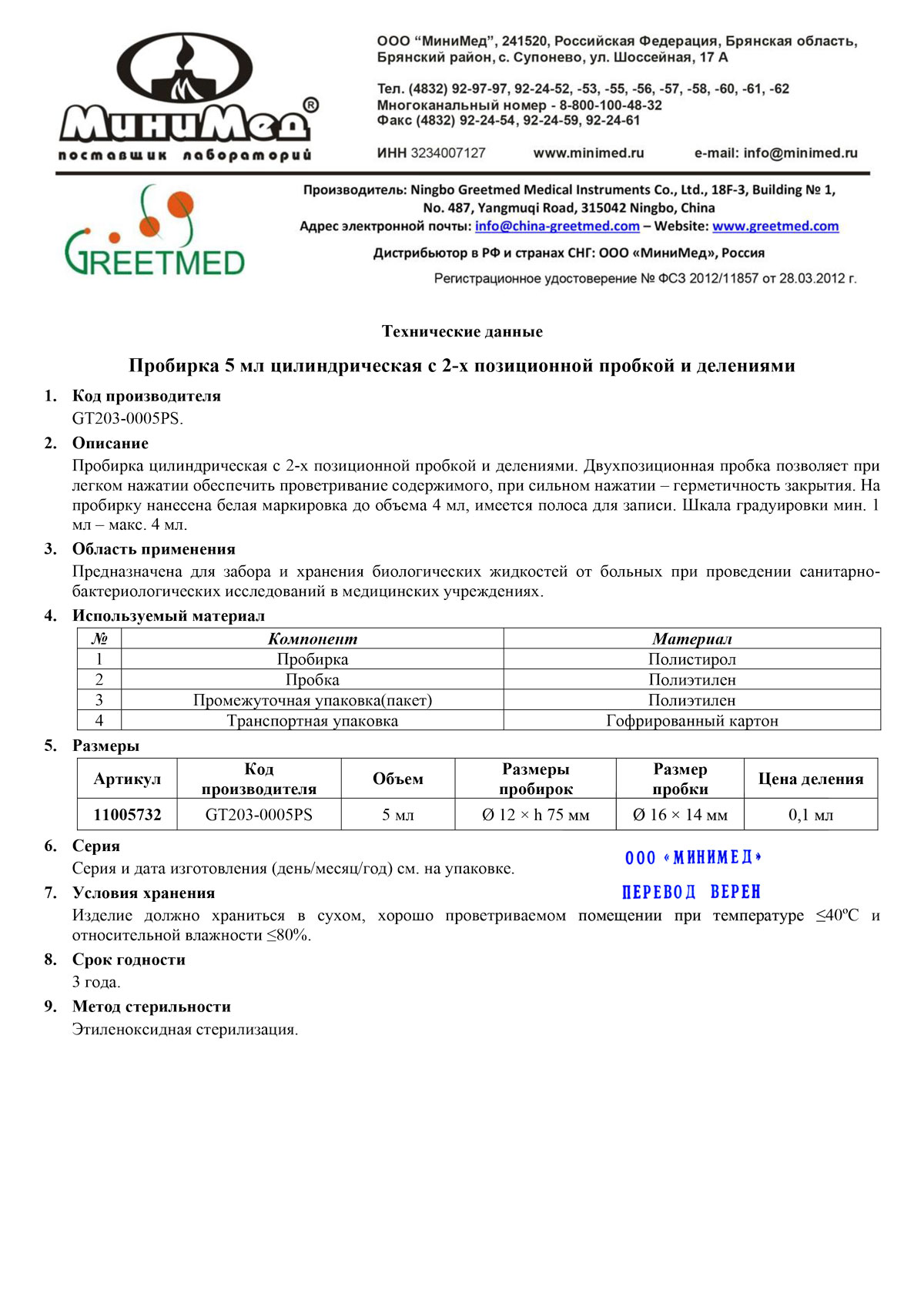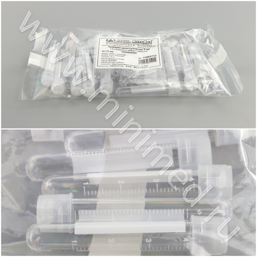 Пробирка лабораторная 5 мл, цилиндрическая,12*75 мм, с 2-х позиционной пробкой,с дел.,п/с, стер., уп.25/1000 шт, Гритмед