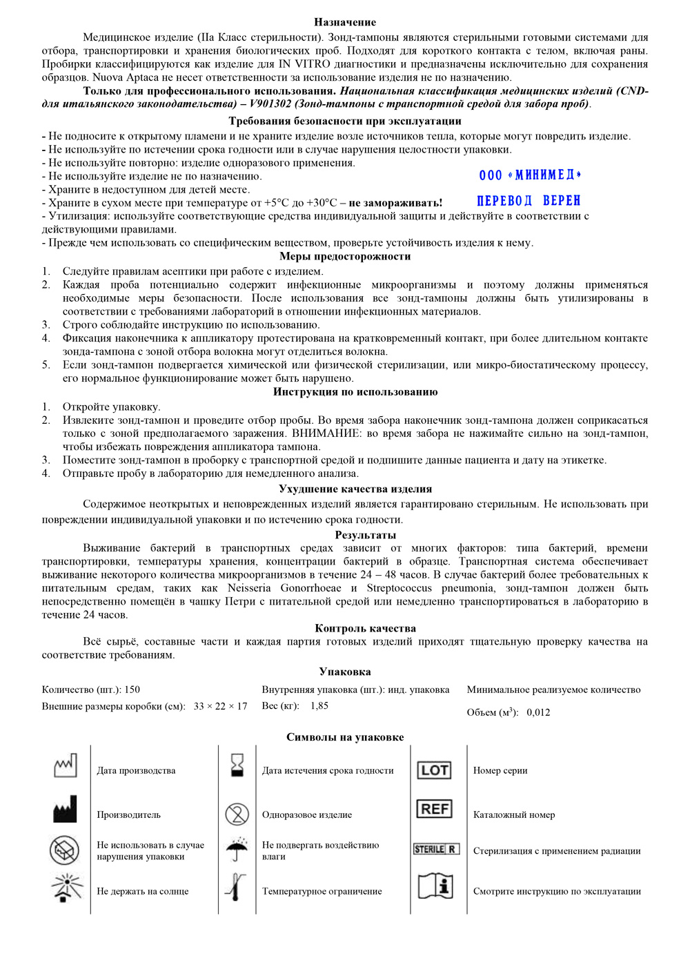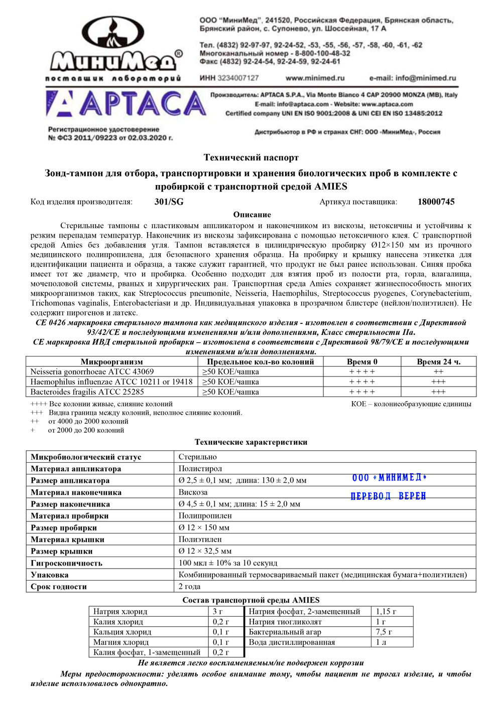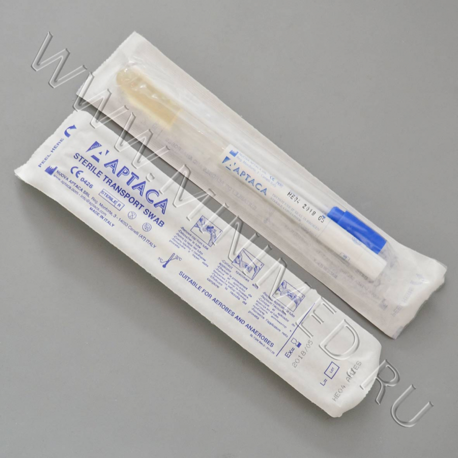 Зонд-тампон для отбора, транспорт. и хранения биолог. проб в комплекте с пробиркой с транспорт. средой AMIES, стерильн.,инд.уп.150 шт/кор.900 шт., Аптака
